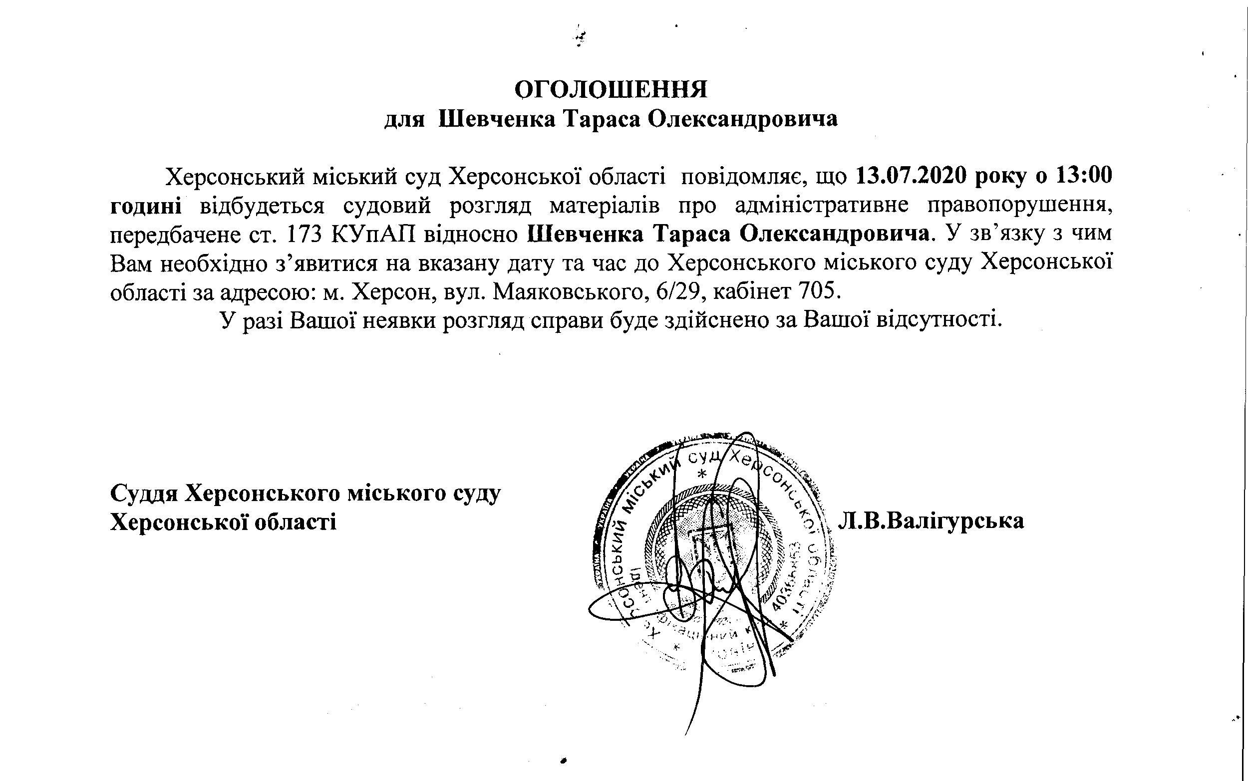 ОГОЛОШЕННЯ ПРО ВИКЛИК ДО СУДУ