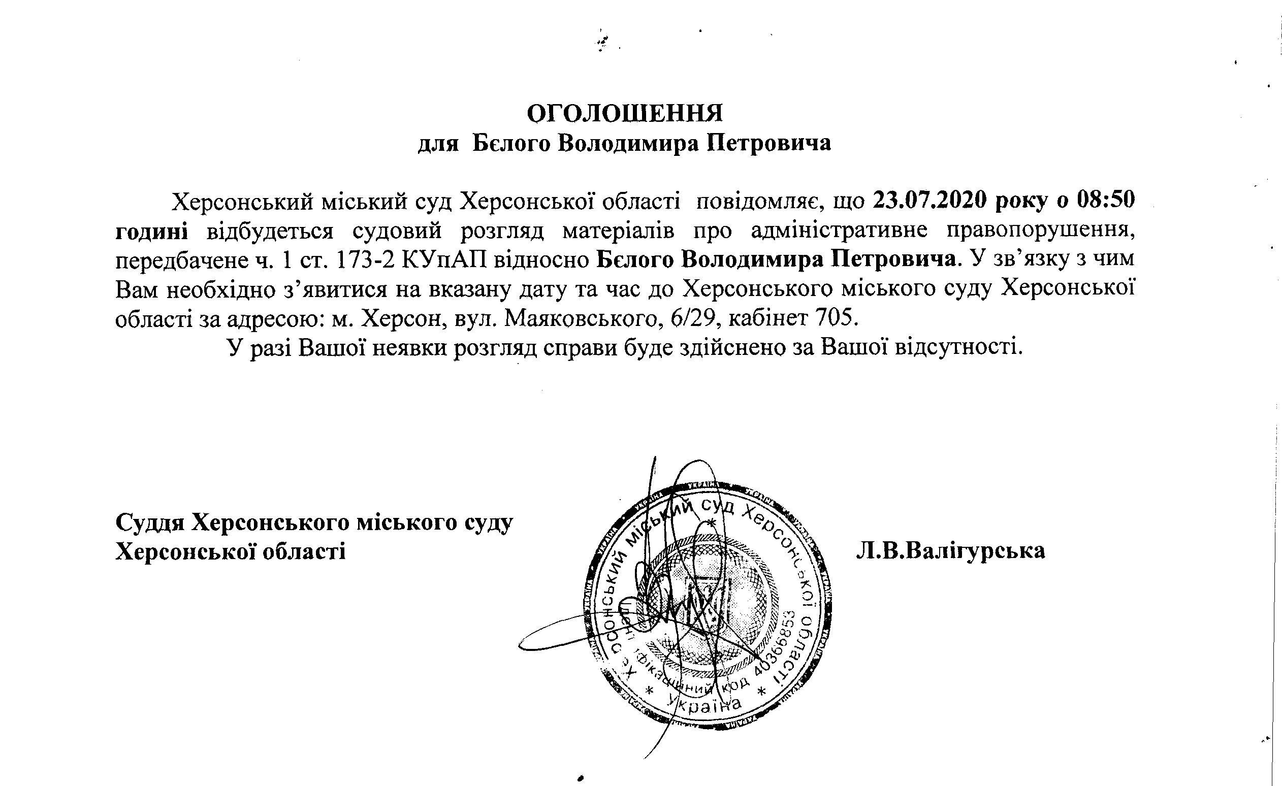 ОГОЛОШЕННЯ для Бєлого Володимира Петровича