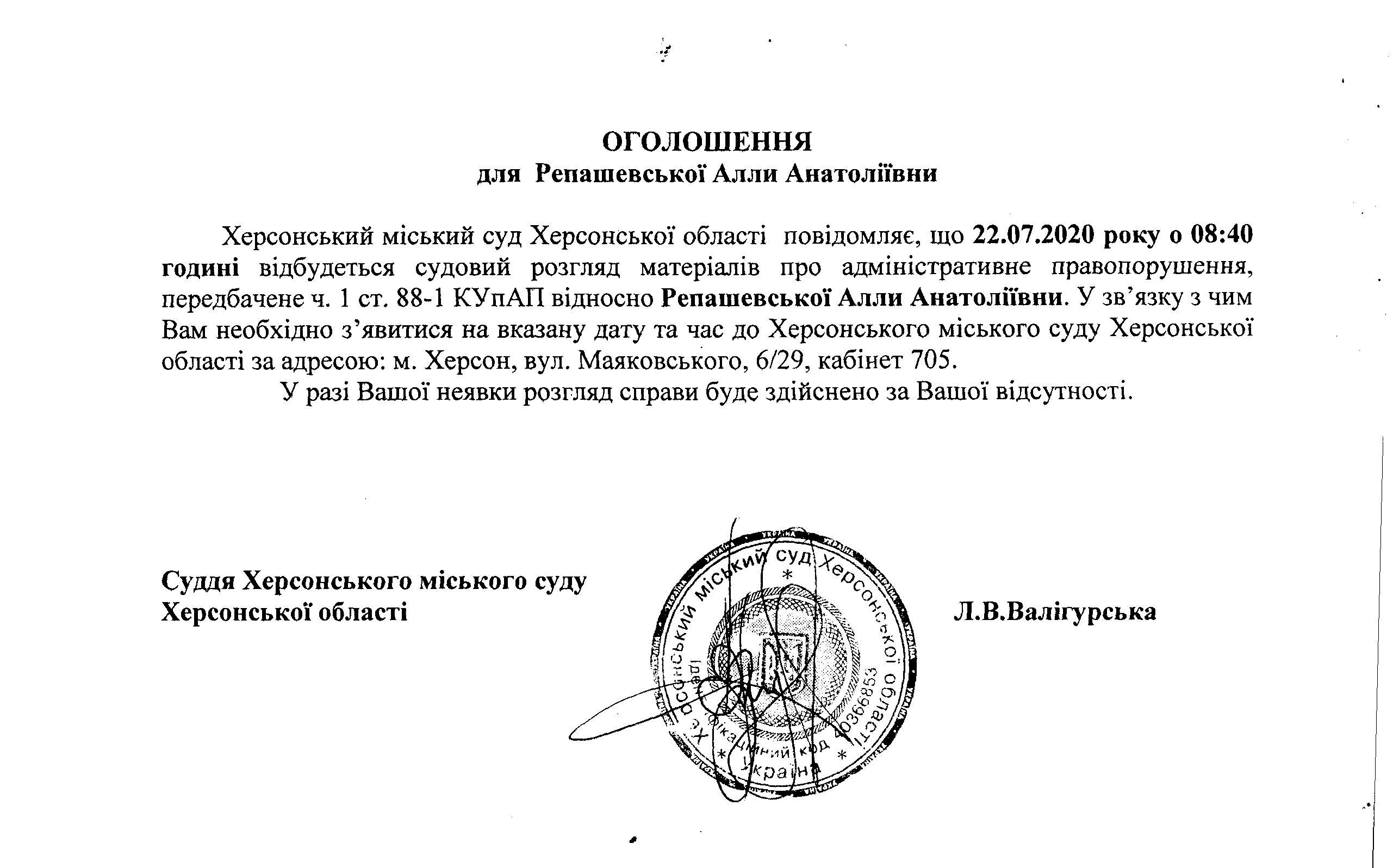 ОГОЛОШЕННЯ для Репашевської Алли Анатоліївни