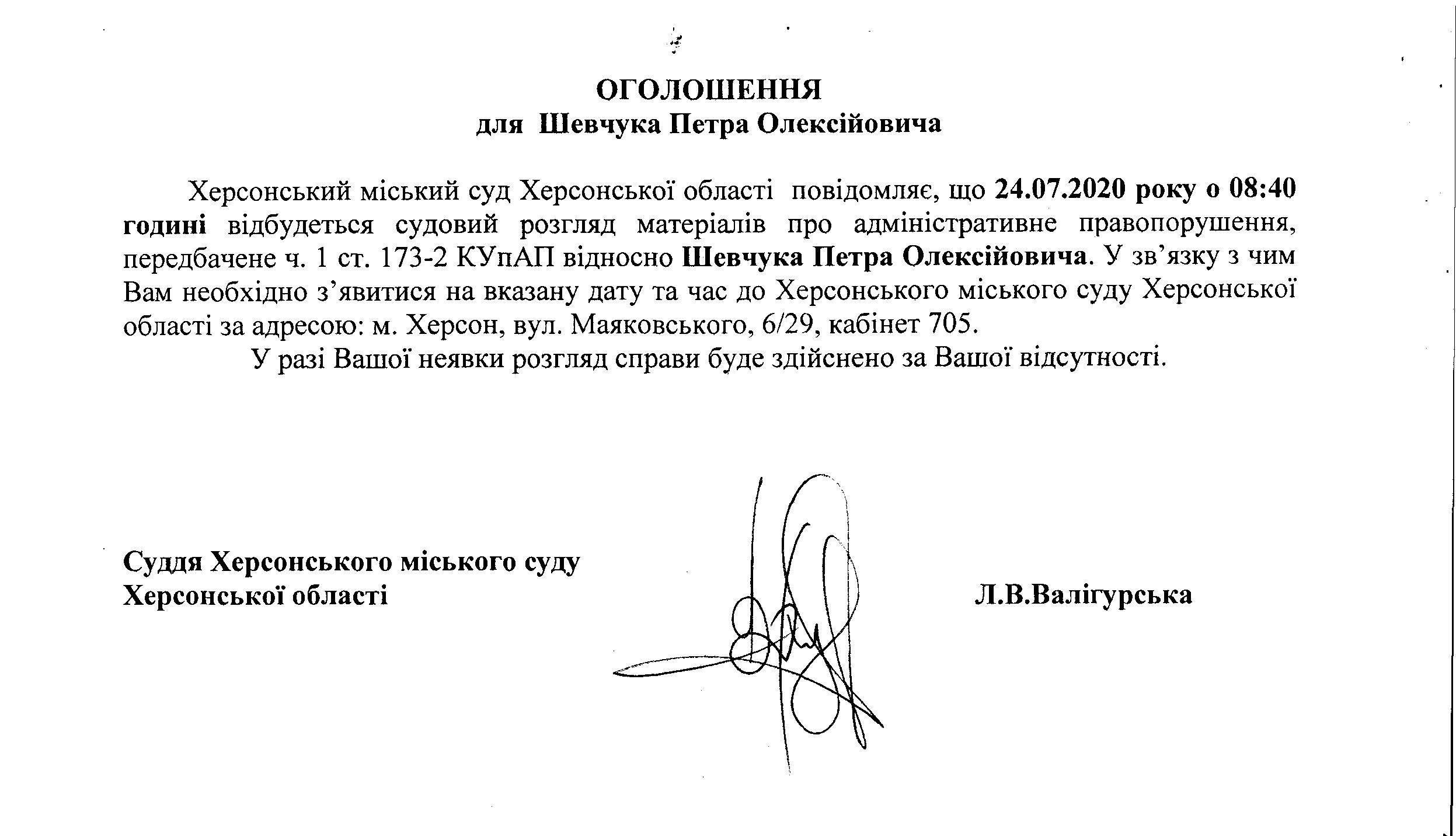 ОГОЛОШЕННЯ ПРО ВИКЛИК ДО СУДУ