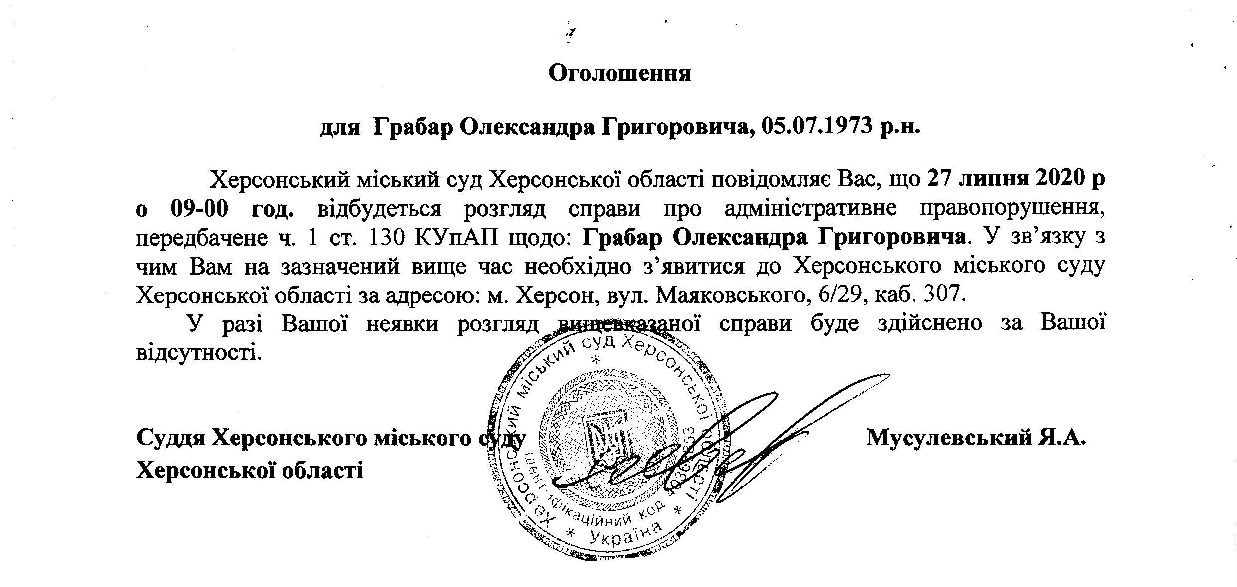 ОГОЛОШЕННЯ для Грабар Олександра Григоровича