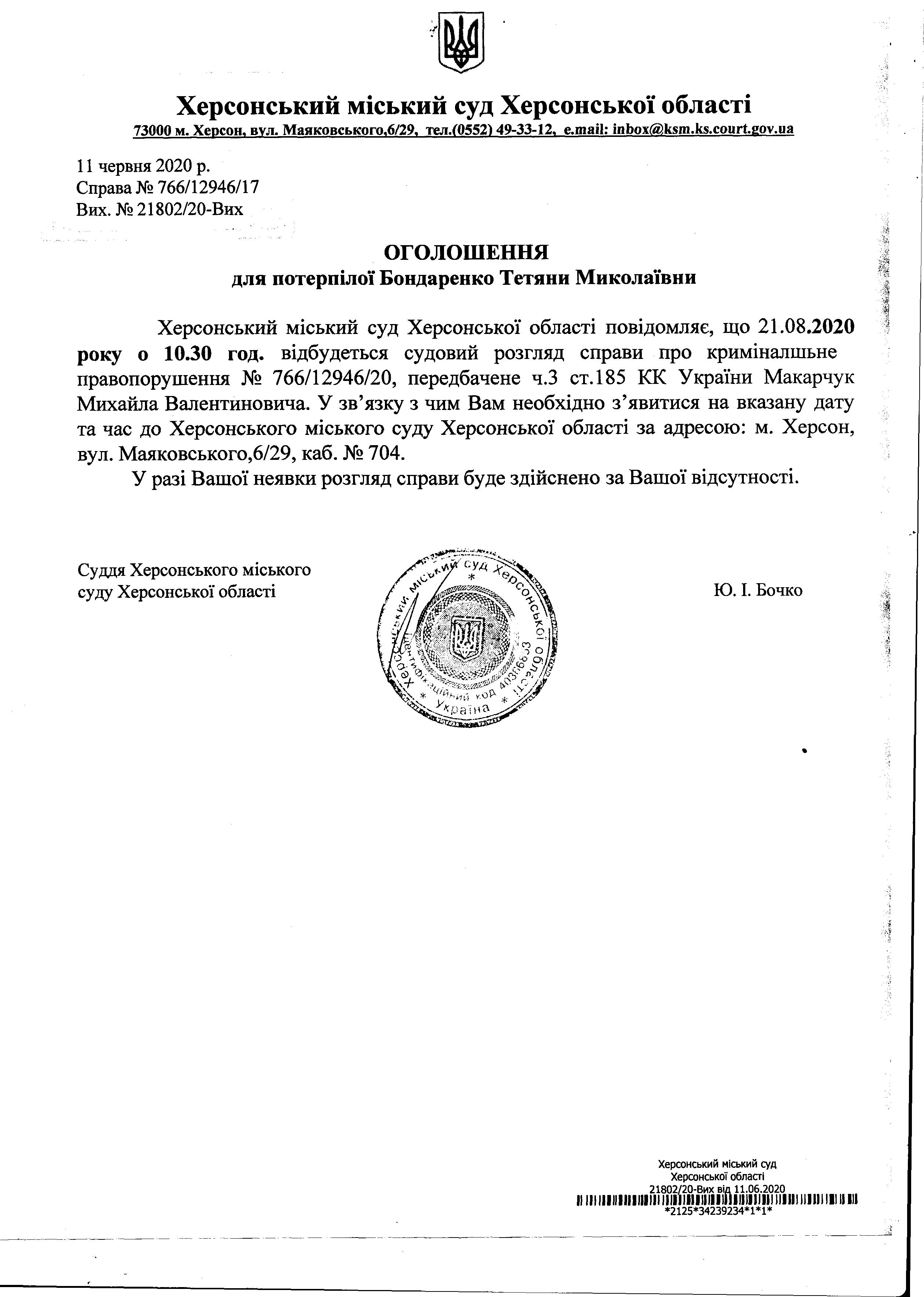 ОГОЛОШЕННЯ для Бондаренко Тетяни Миколаївни