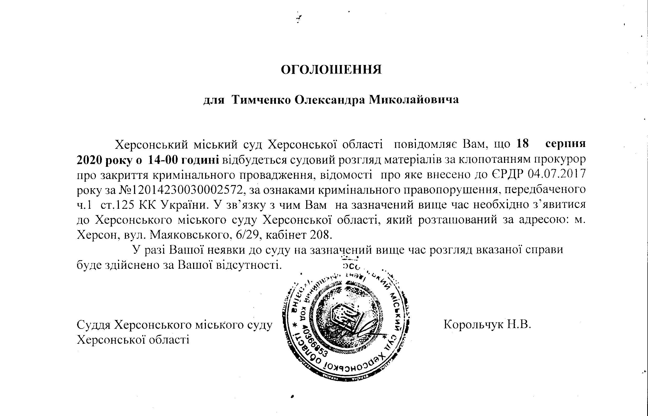 ОГОЛОШЕННЯ для Тимченко Олександра Миколайовича
