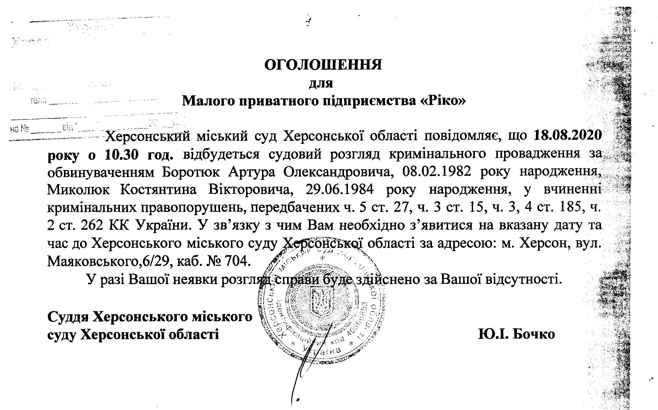 ОГОЛОШЕННЯ ПРО ВИКЛИК ДО СУДУ