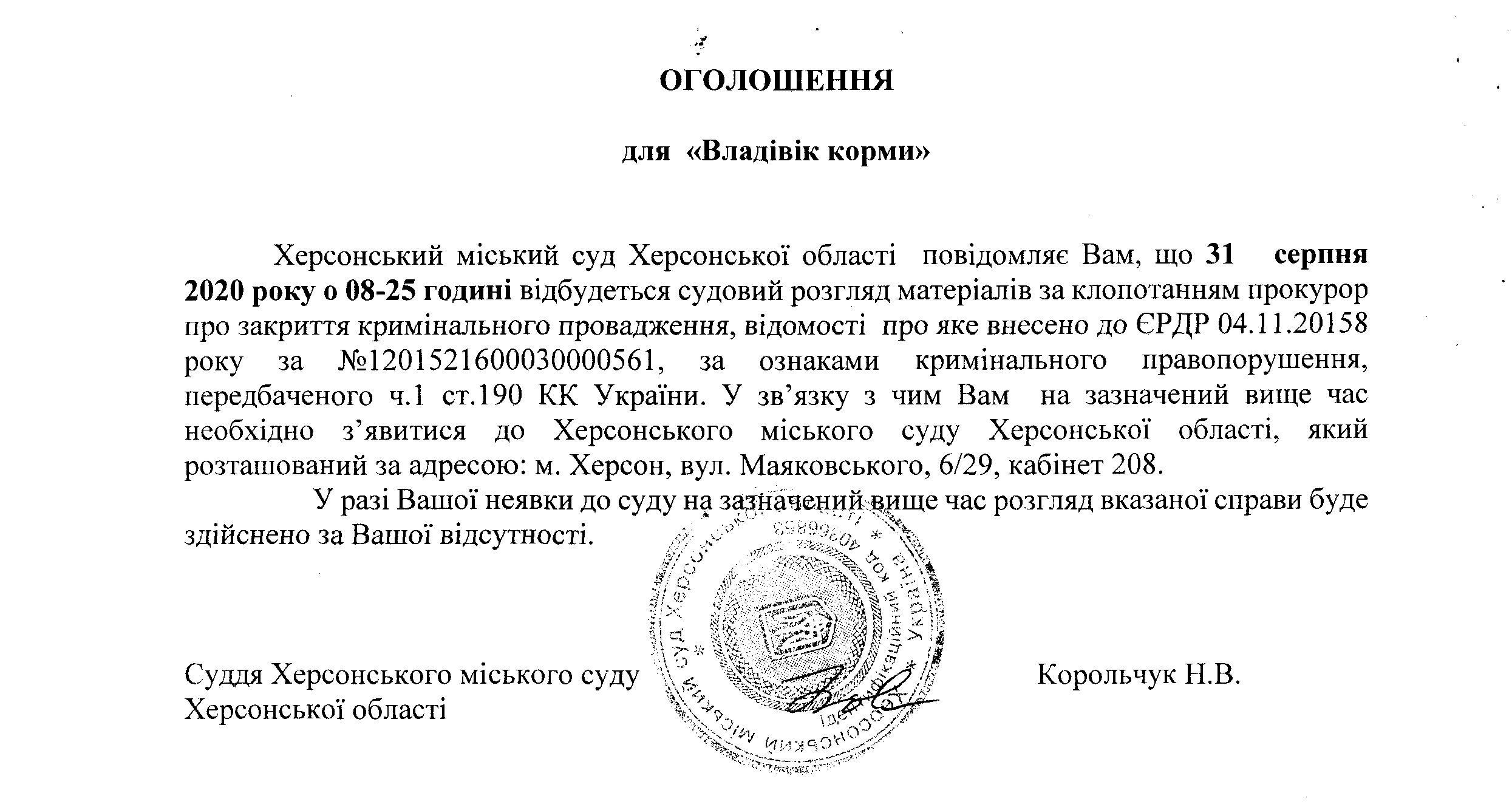 ОГОЛОШЕННЯ ПРО ВИКЛИК ДО СУДУ