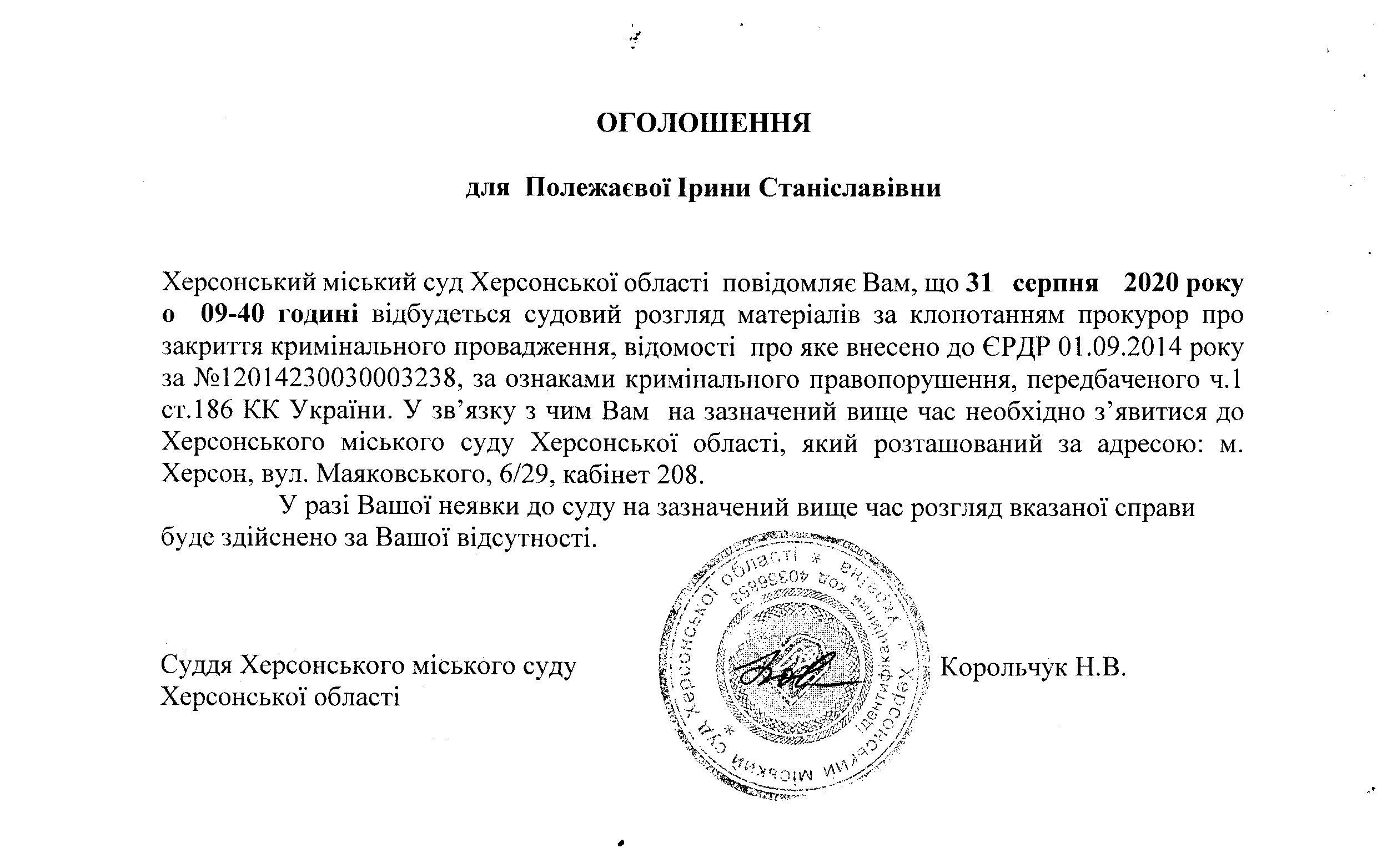ОГОЛОШЕННЯ для Полежаєвої Ірини Станіславівни