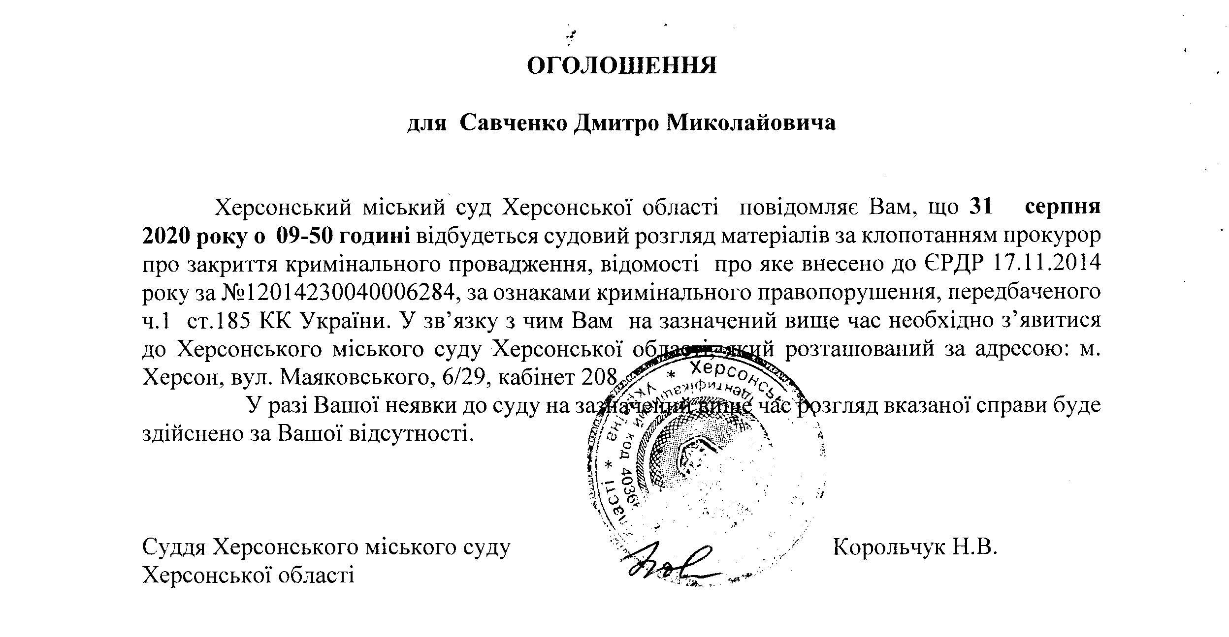 ОГОЛОШЕННЯ для Савченко Дмитра Миколайовича