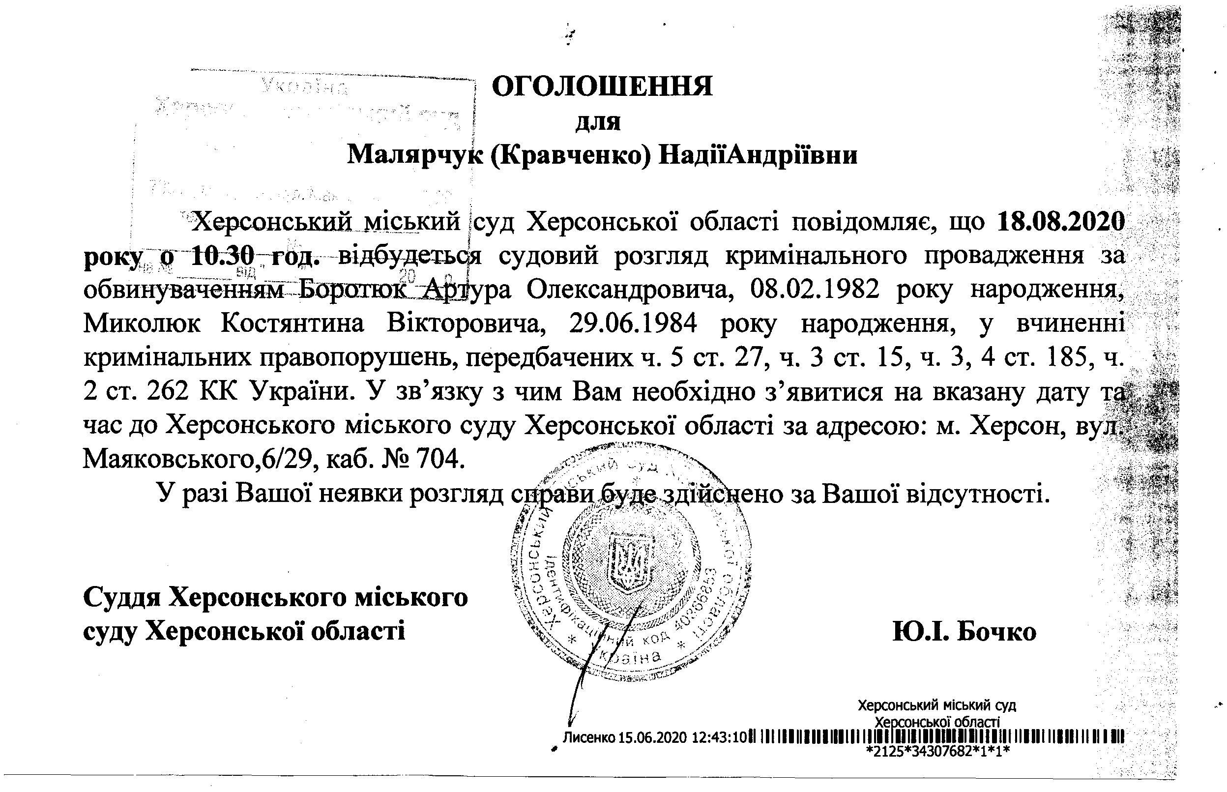 ОГОЛОШЕННЯ ПРО ВИКЛИК ДО СУДУ