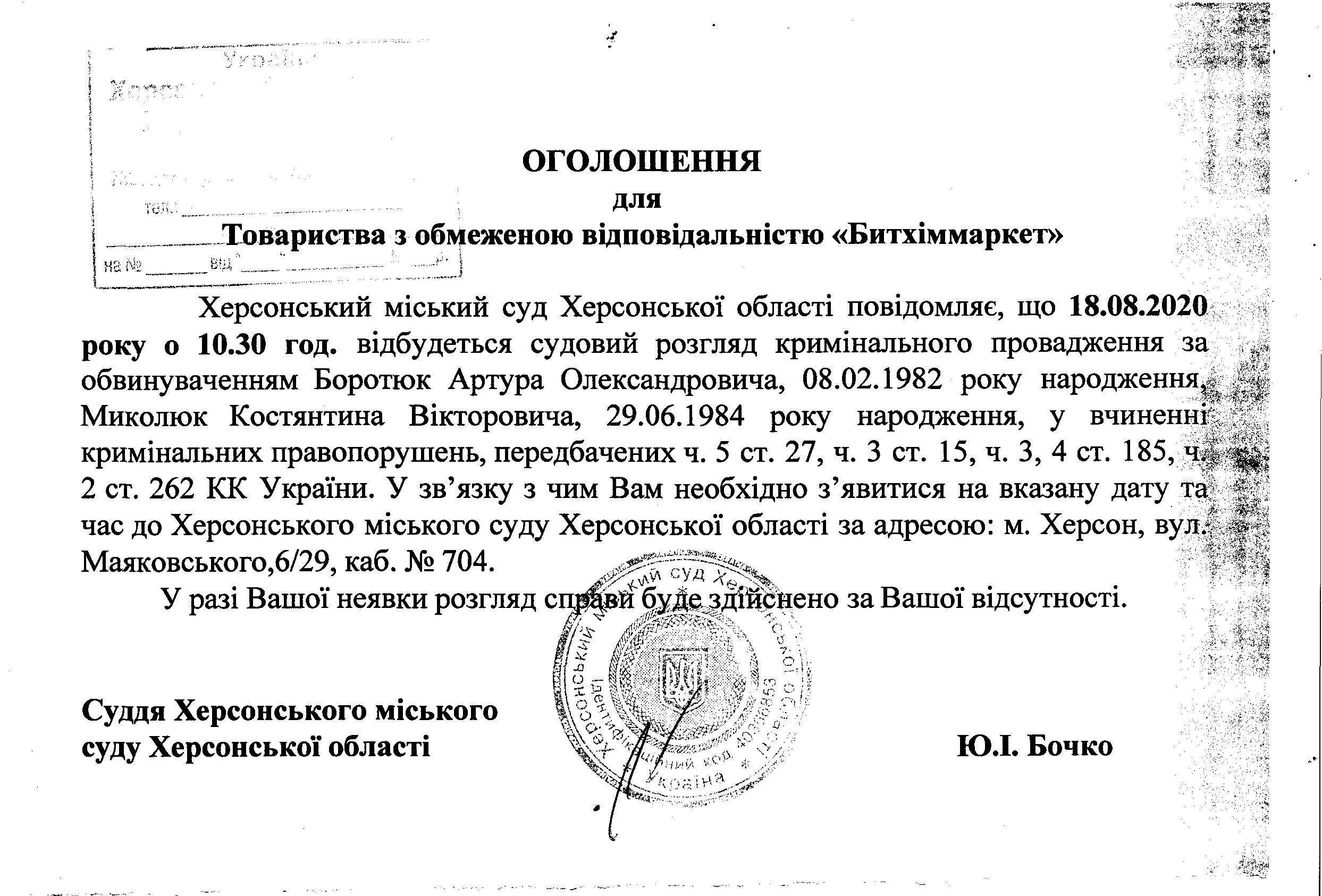 ОГОЛОШЕННЯ для ТОВ "Битхіммаркет"