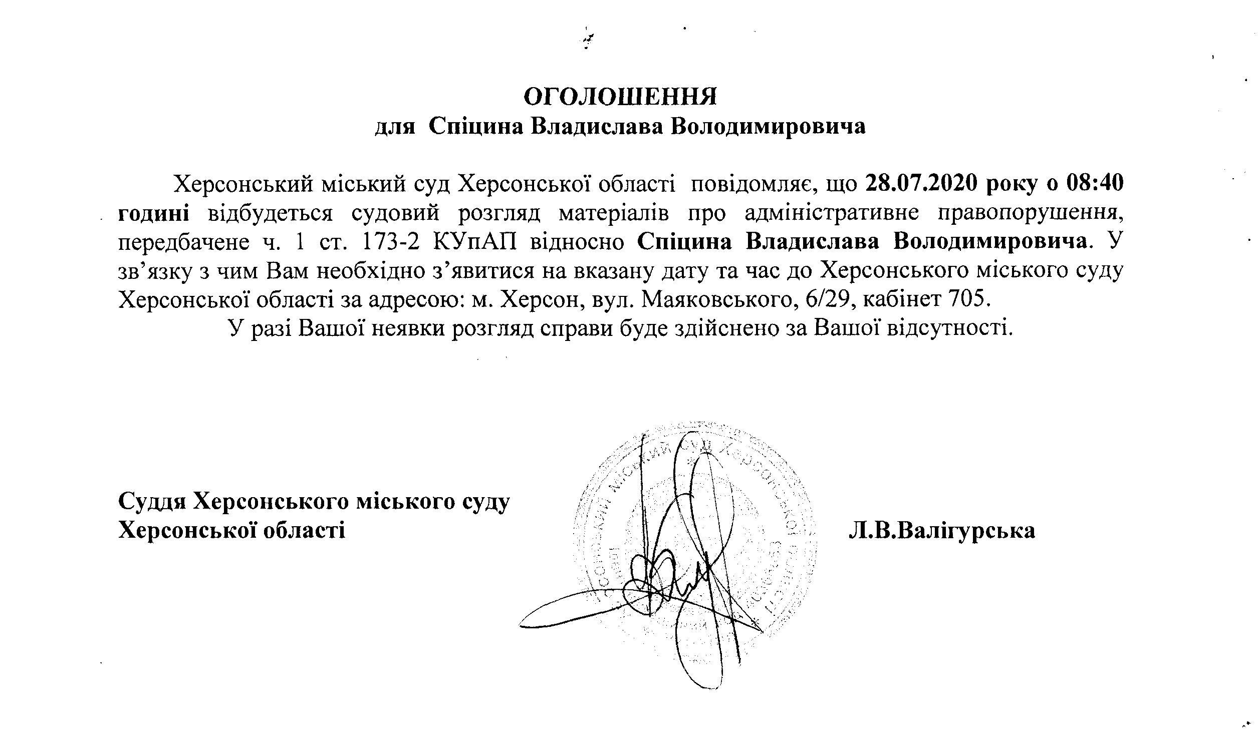 ОГОЛОШЕННЯ для Спіцина Владислава Володимировича