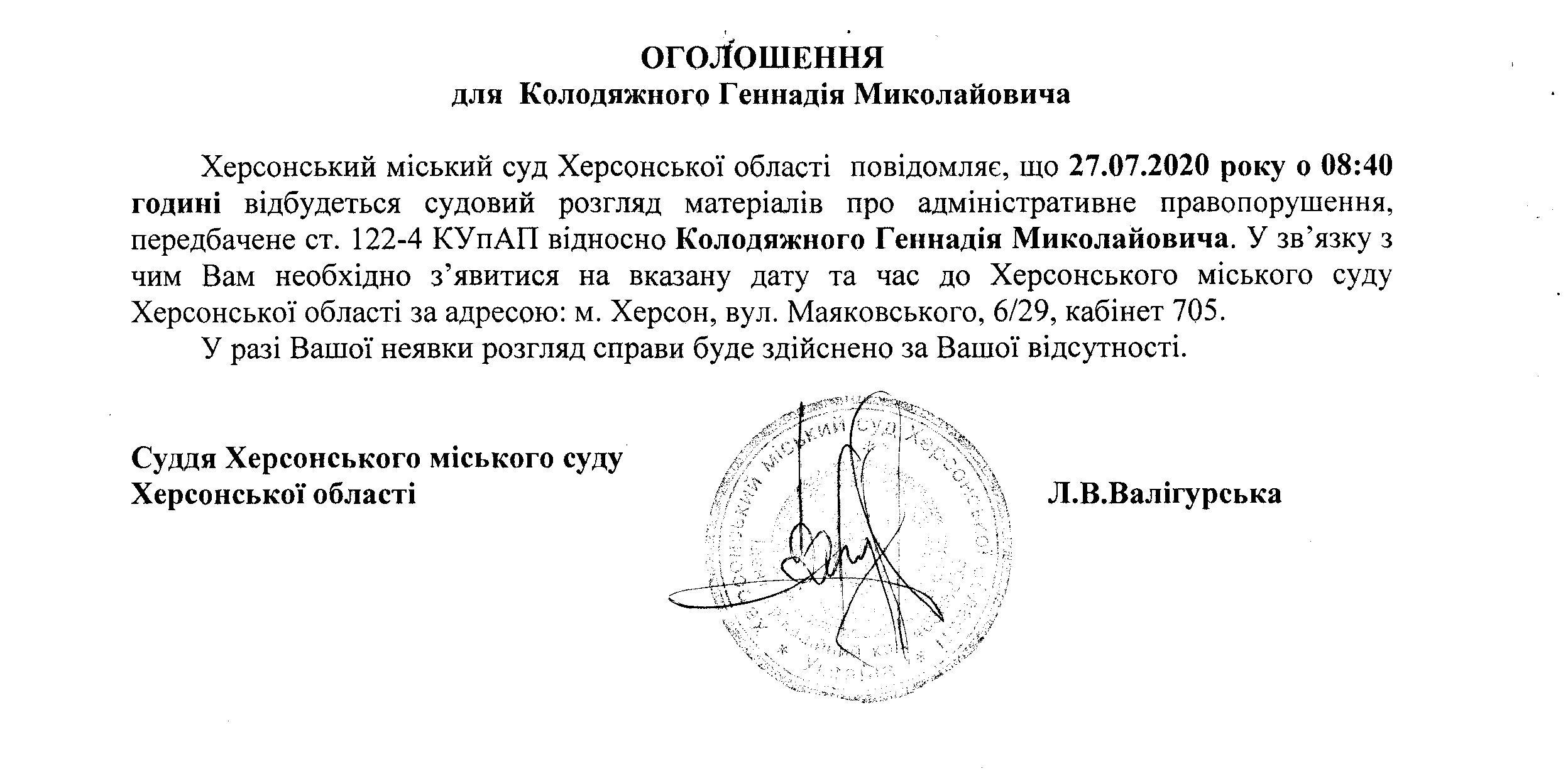 ОГОЛОШЕННЯ для Колодяжного Геннадія Миколайовича