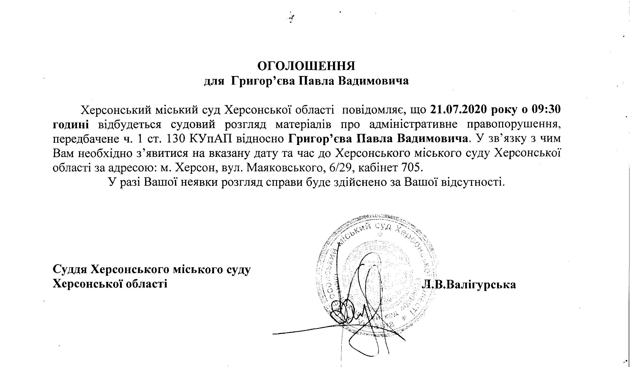 ОГОЛОШЕННЯ для Григор`єва Павла Вадимовича