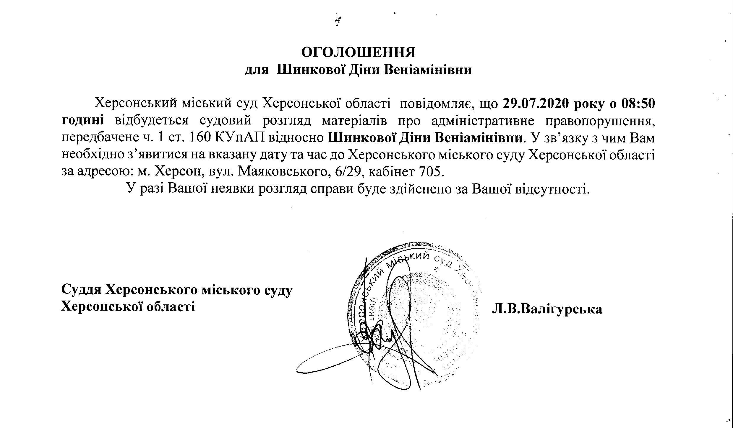 ОГОЛОШЕННЯ для Шинкової Діни Веніамінівни
