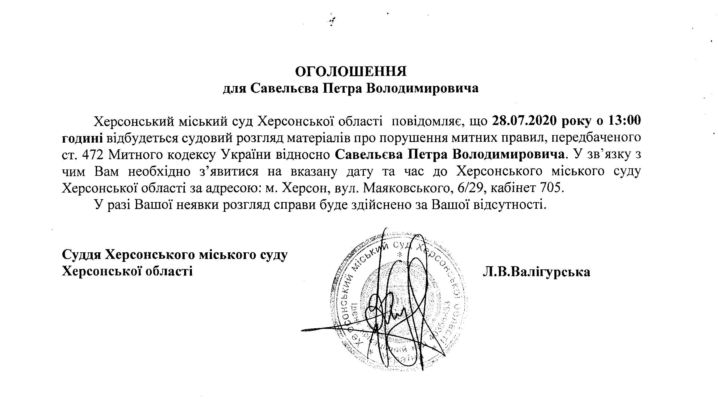ОГОЛОШЕННЯ для Савельєва Петра Володимировича