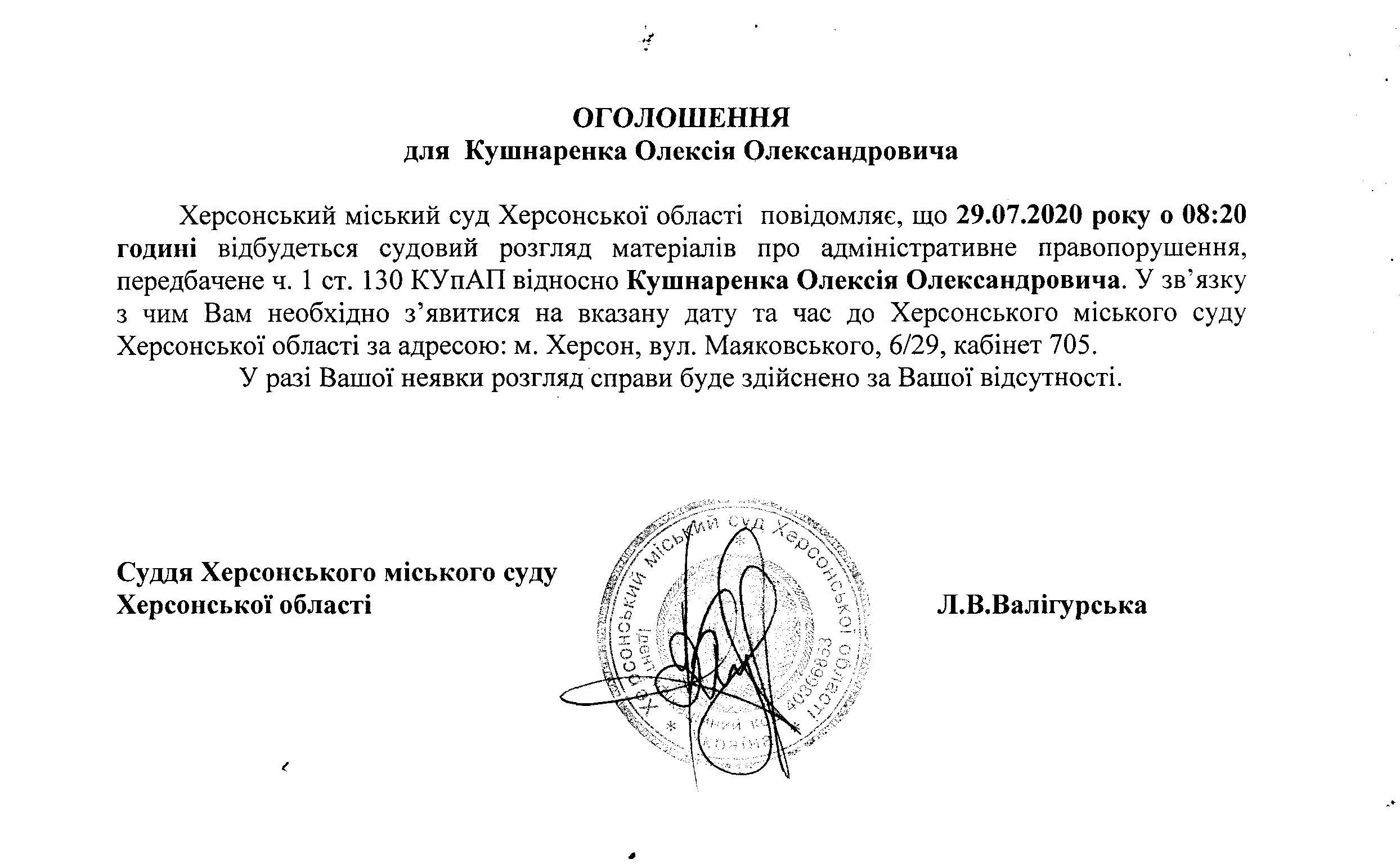 ОГОЛОШЕННЯ для Кушнаренка Олексія Олександровича