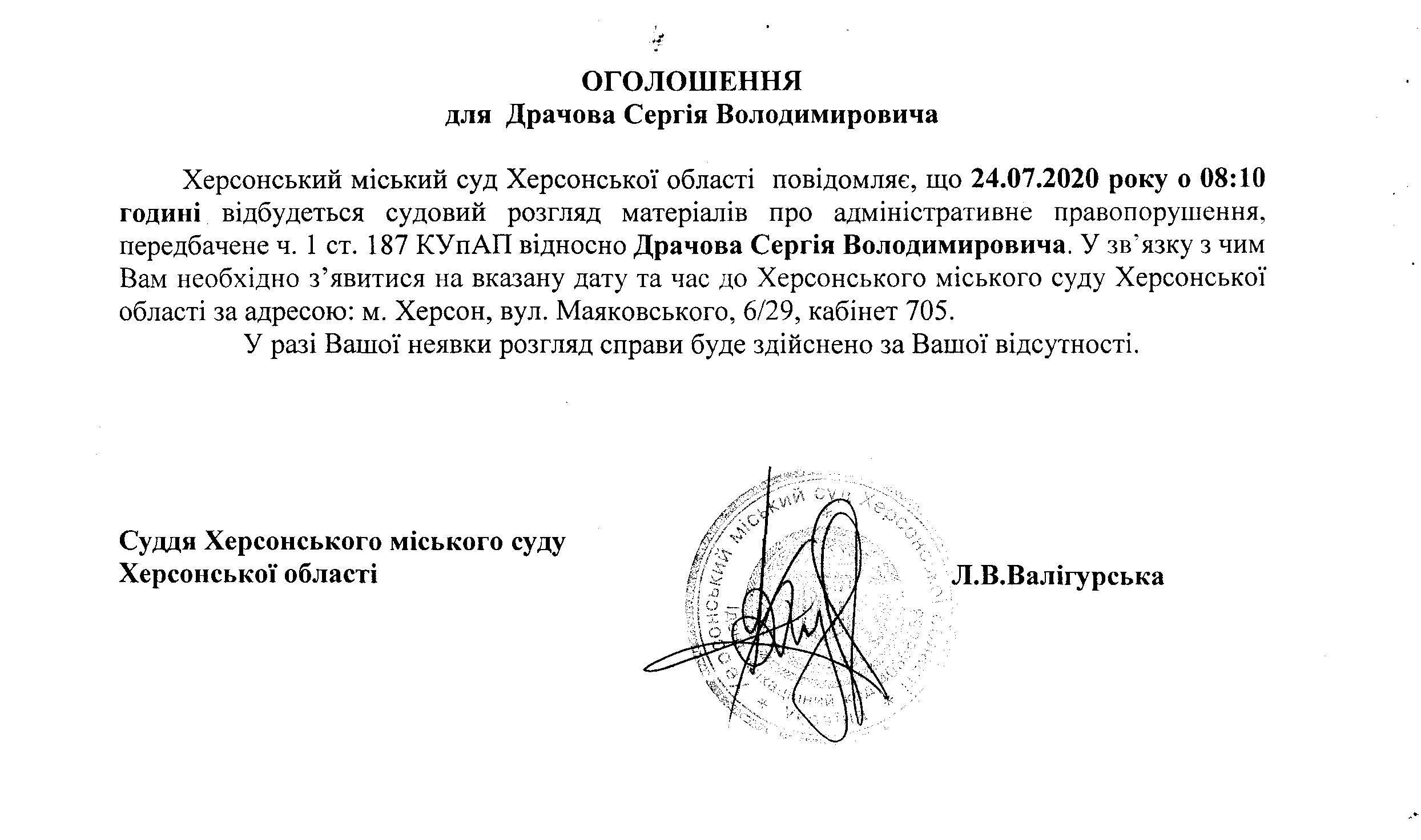ОГОЛОШЕННЯ для Драчова Сергія Володимировича