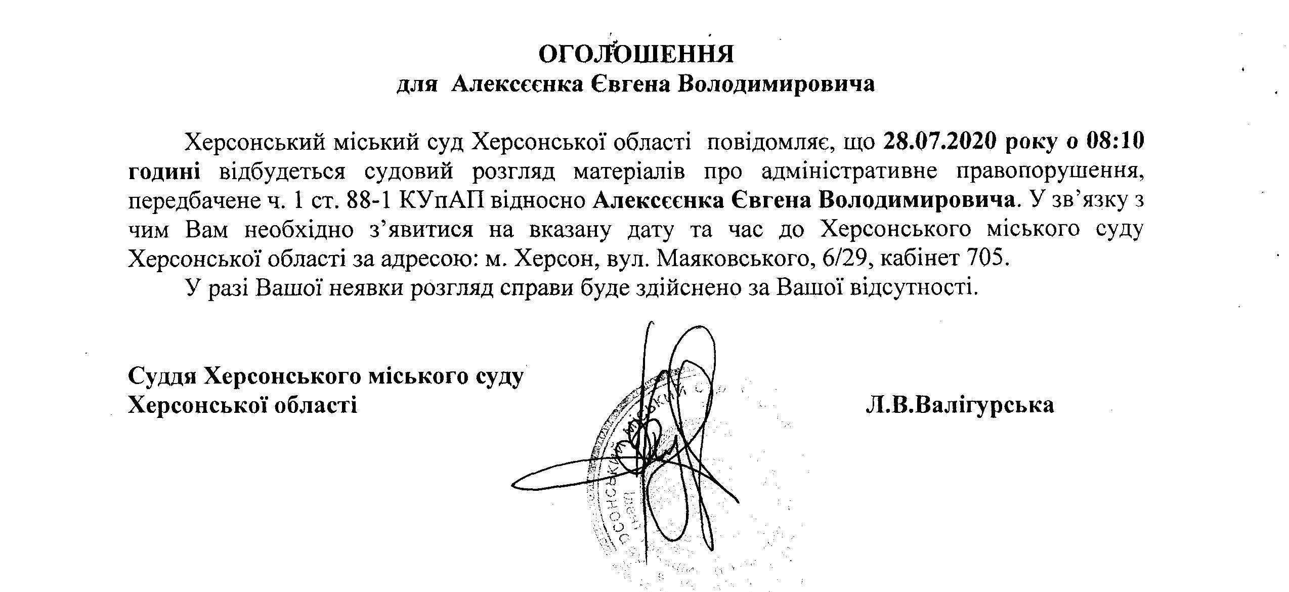 ОГОЛОШЕННЯ ПРО ВИКЛИК ДО СУДУ