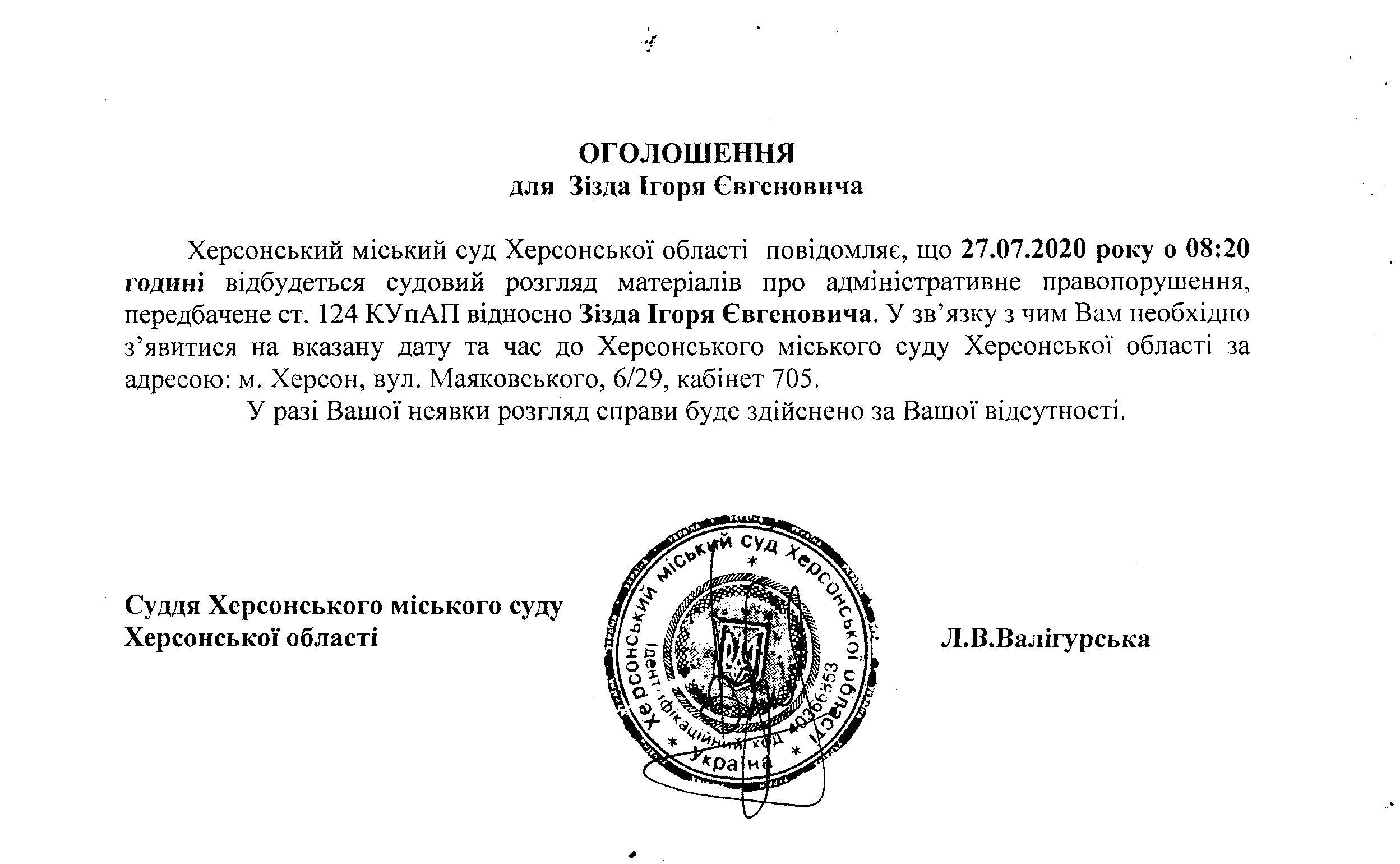 ОГОЛОШЕННЯ ПРО ВИКЛИК ДО СУДУ
