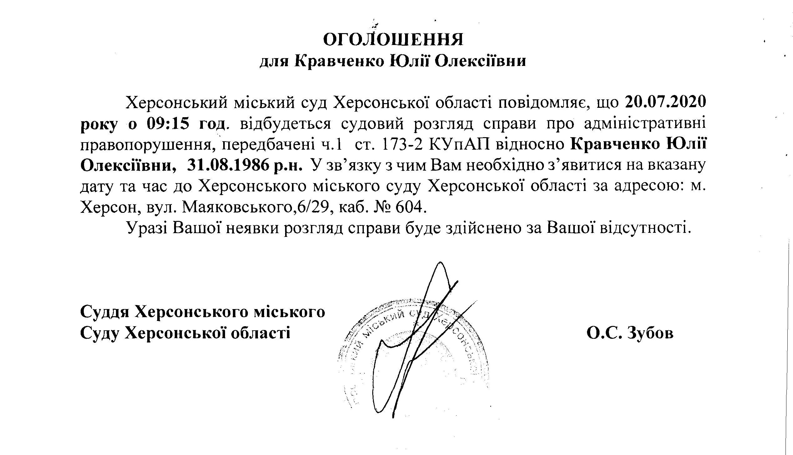 ОГОЛОШЕННЯ для Кравченко Юлії Олексіївни