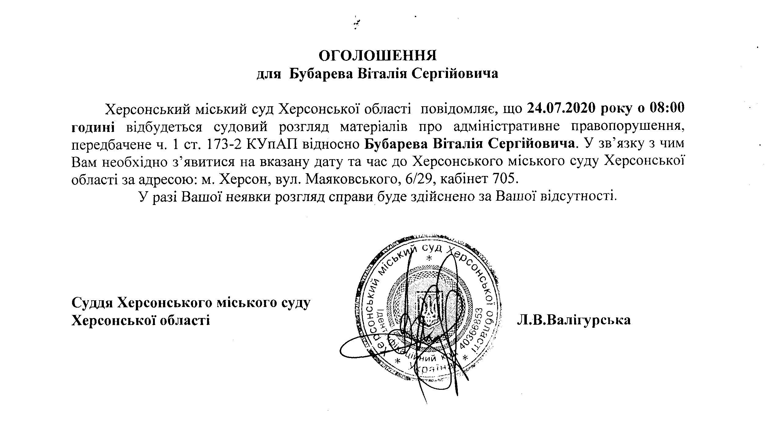 ОГОЛОШЕННЯ для Бубарева Віталія Сергійовича
