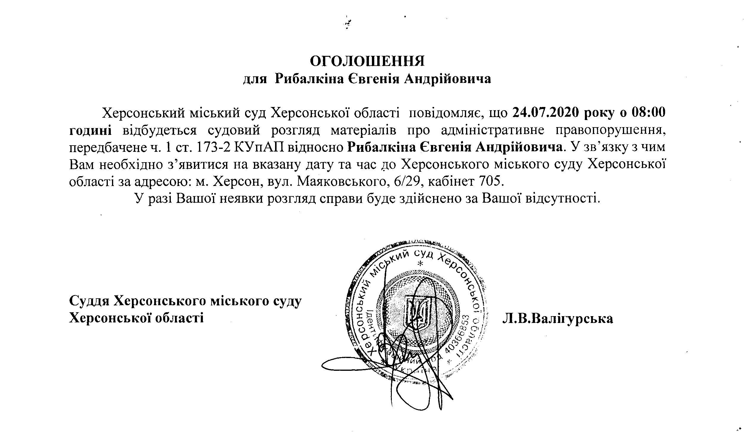 ОГОЛОШЕННЯ для Рибалкіна Євгенія Андрійовича