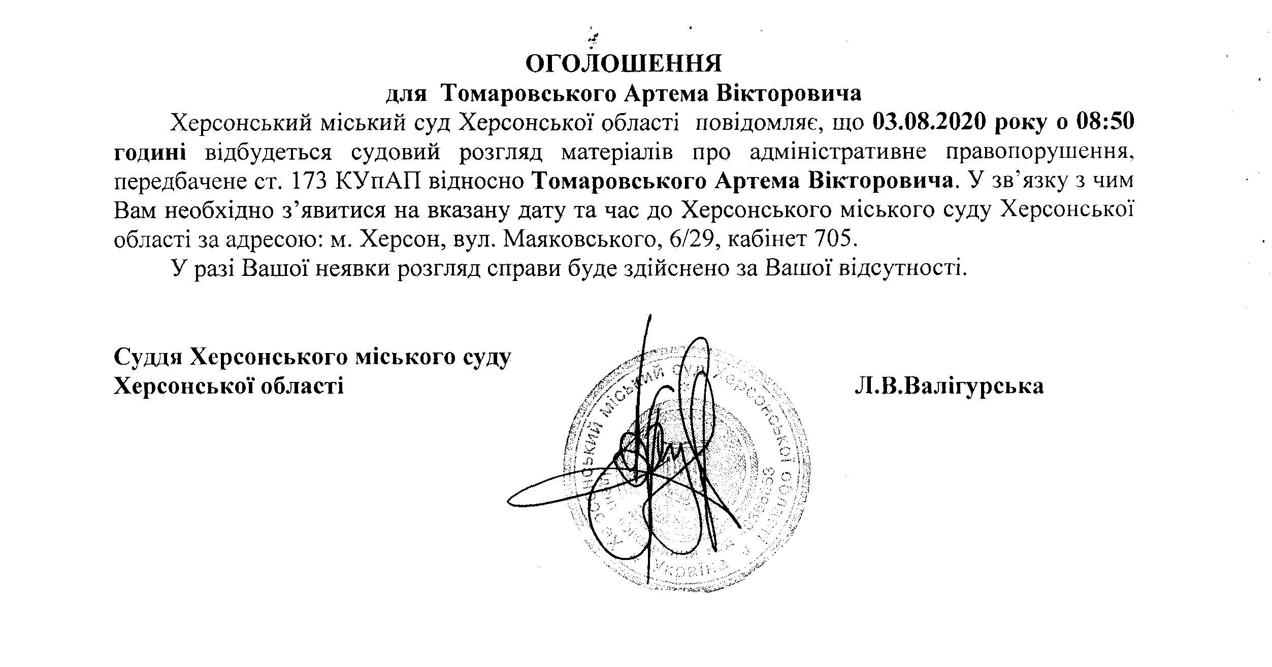 ОГОЛОШЕННЯ для Томаровського Артема Вікторовича