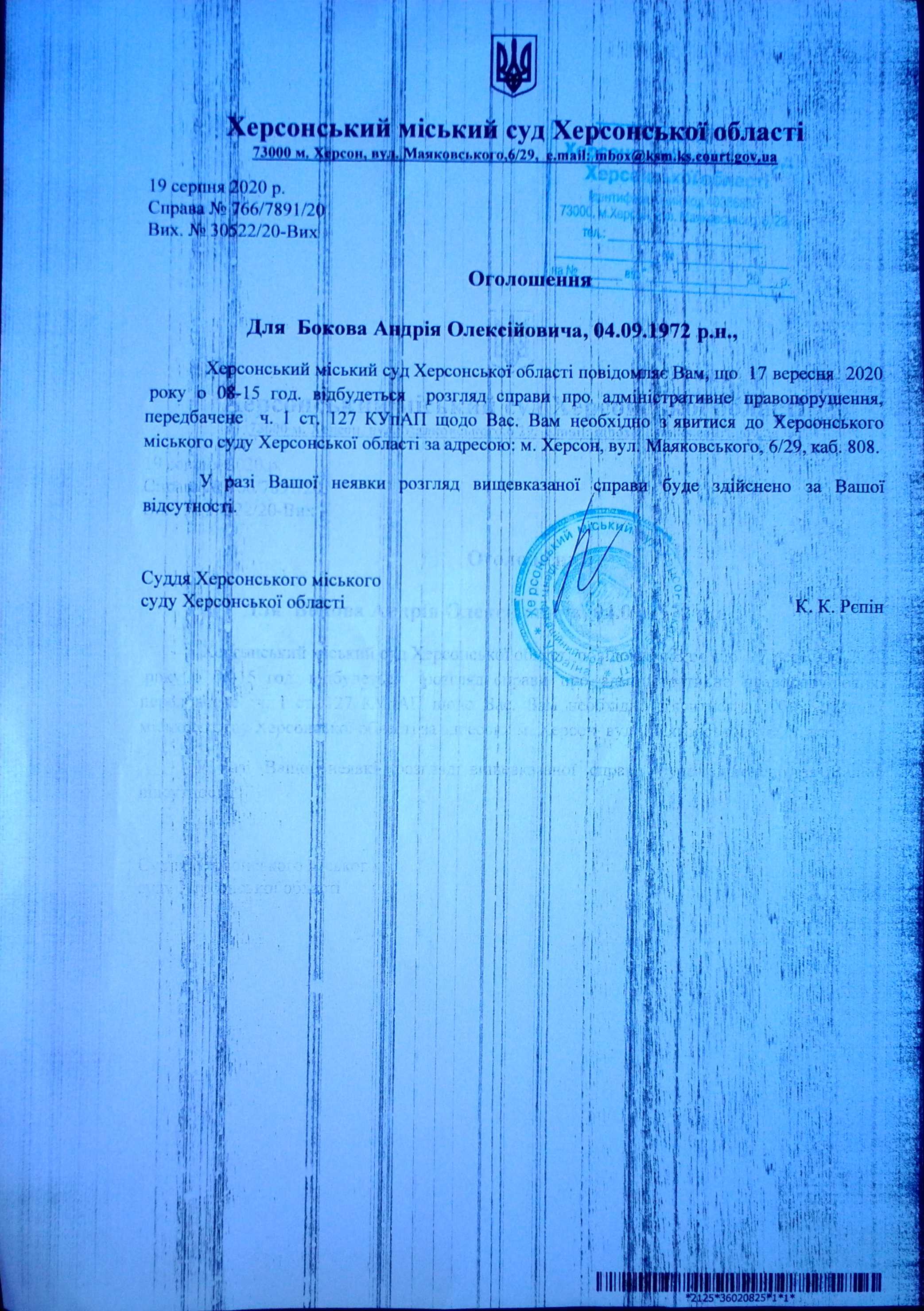 ОГОЛОШЕННЯ для Бокова Андрія Олексійовича