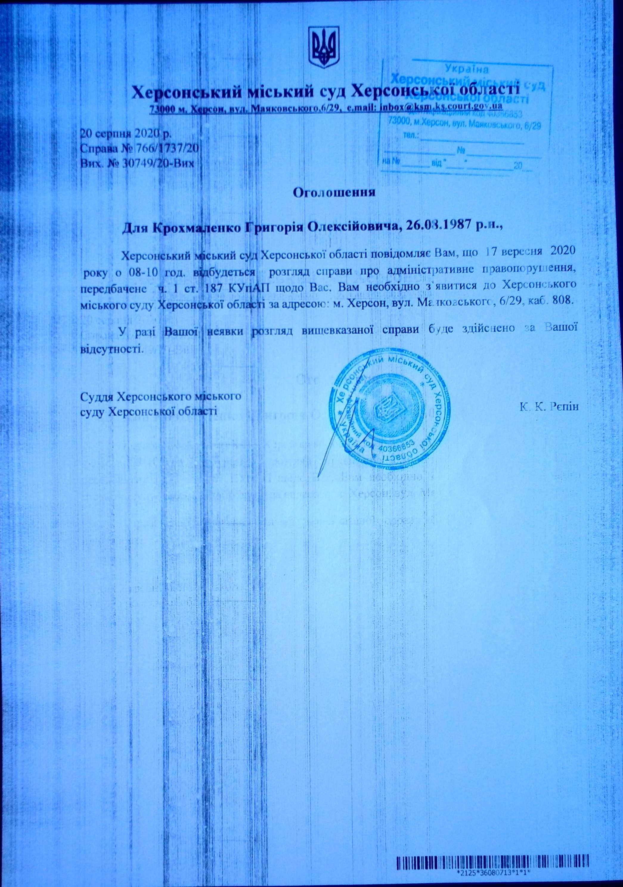 ОГОЛОШЕННЯ для Крохмаленко Григорія Олексійовича