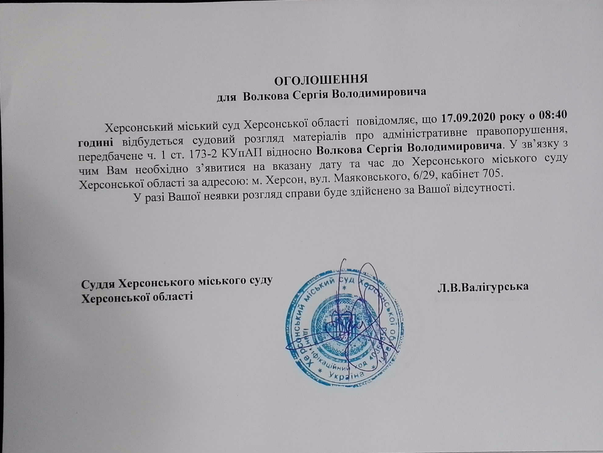 ОГОЛОШЕННЯ для Волкова Сергія Володимировича