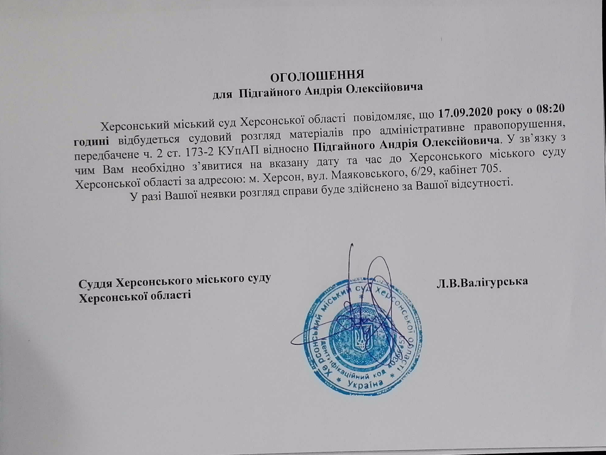 ОГОЛОШЕННЯ ПРО ВИКЛИК ДО СУДУ