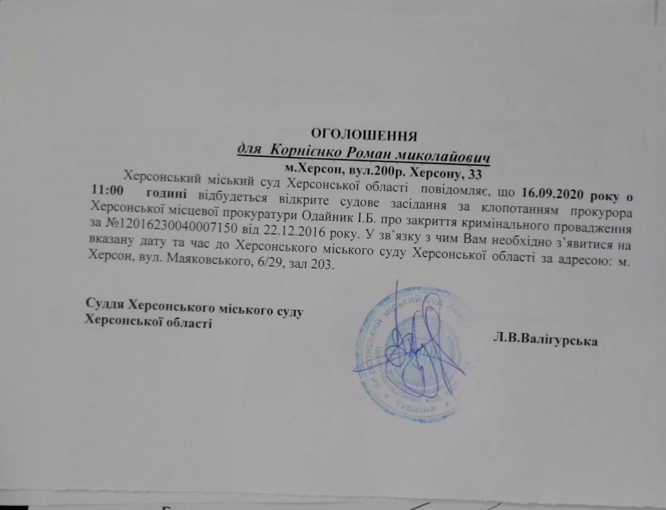 ОГОЛОШЕННЯ для Корнієнко Роман Миколайович