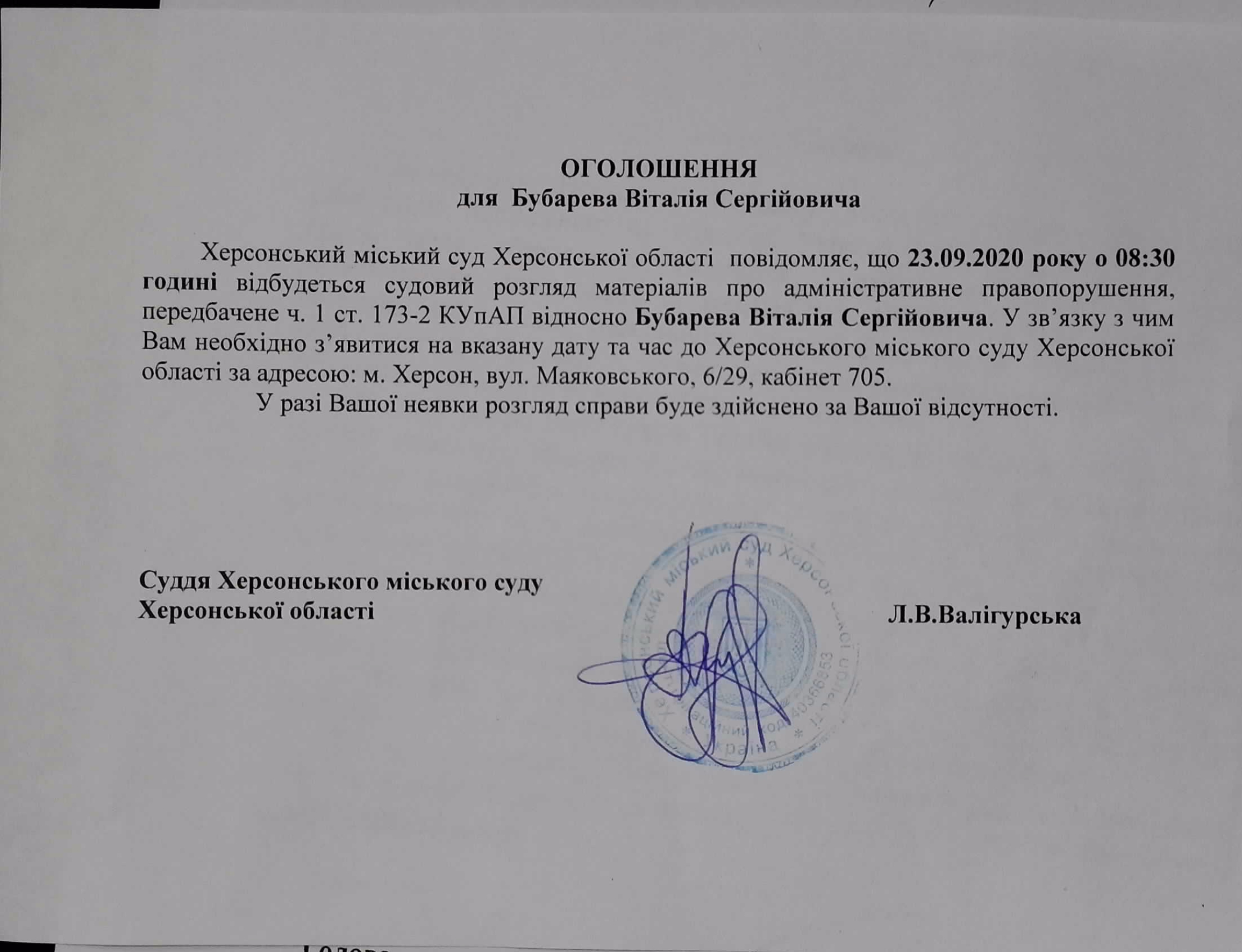 ОГОЛОШЕННЯ для Бубарева Віталія Сергійовича