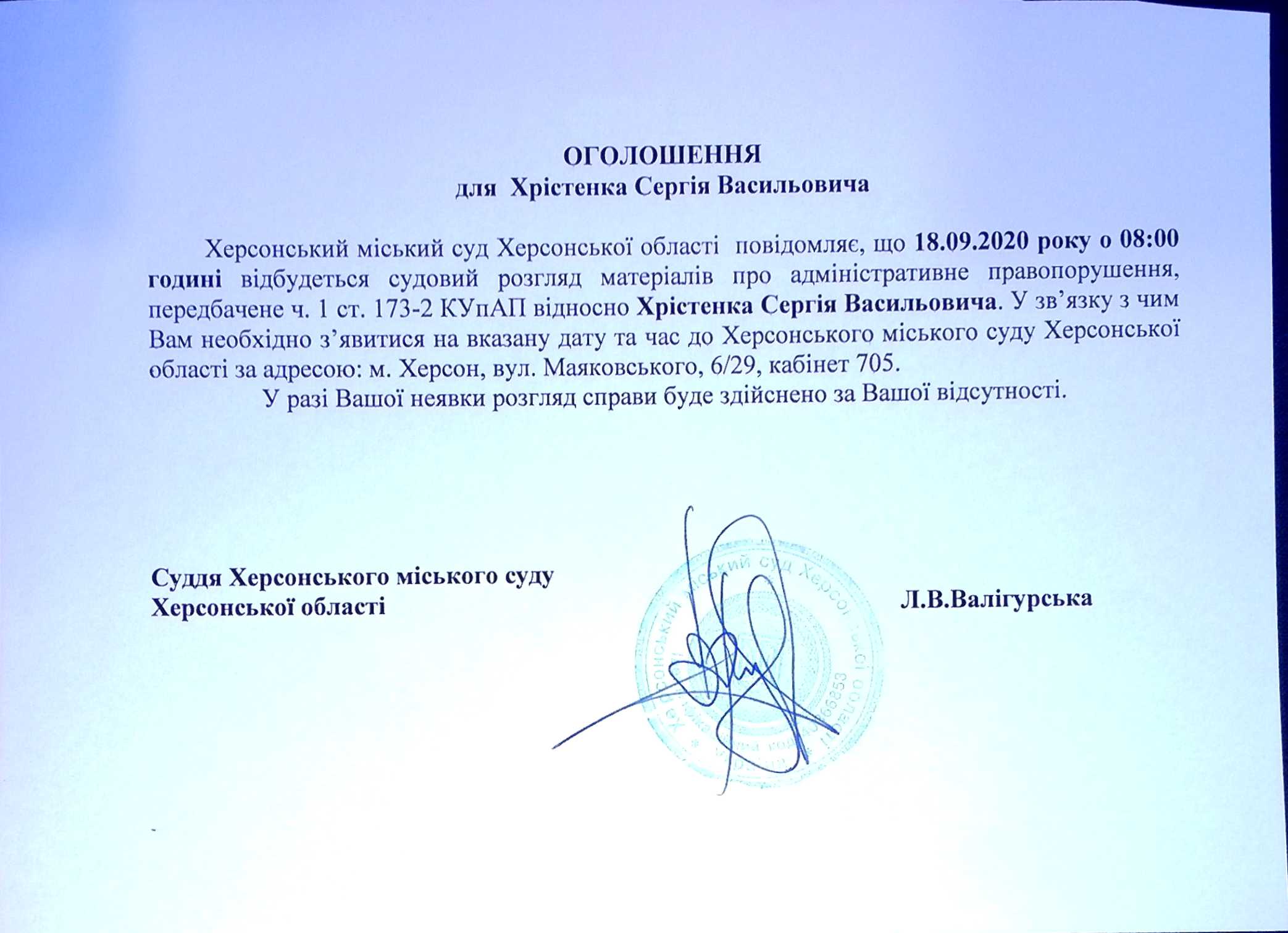 ОГОЛОШЕННЯ для Хрістенка Сергія Васильовича