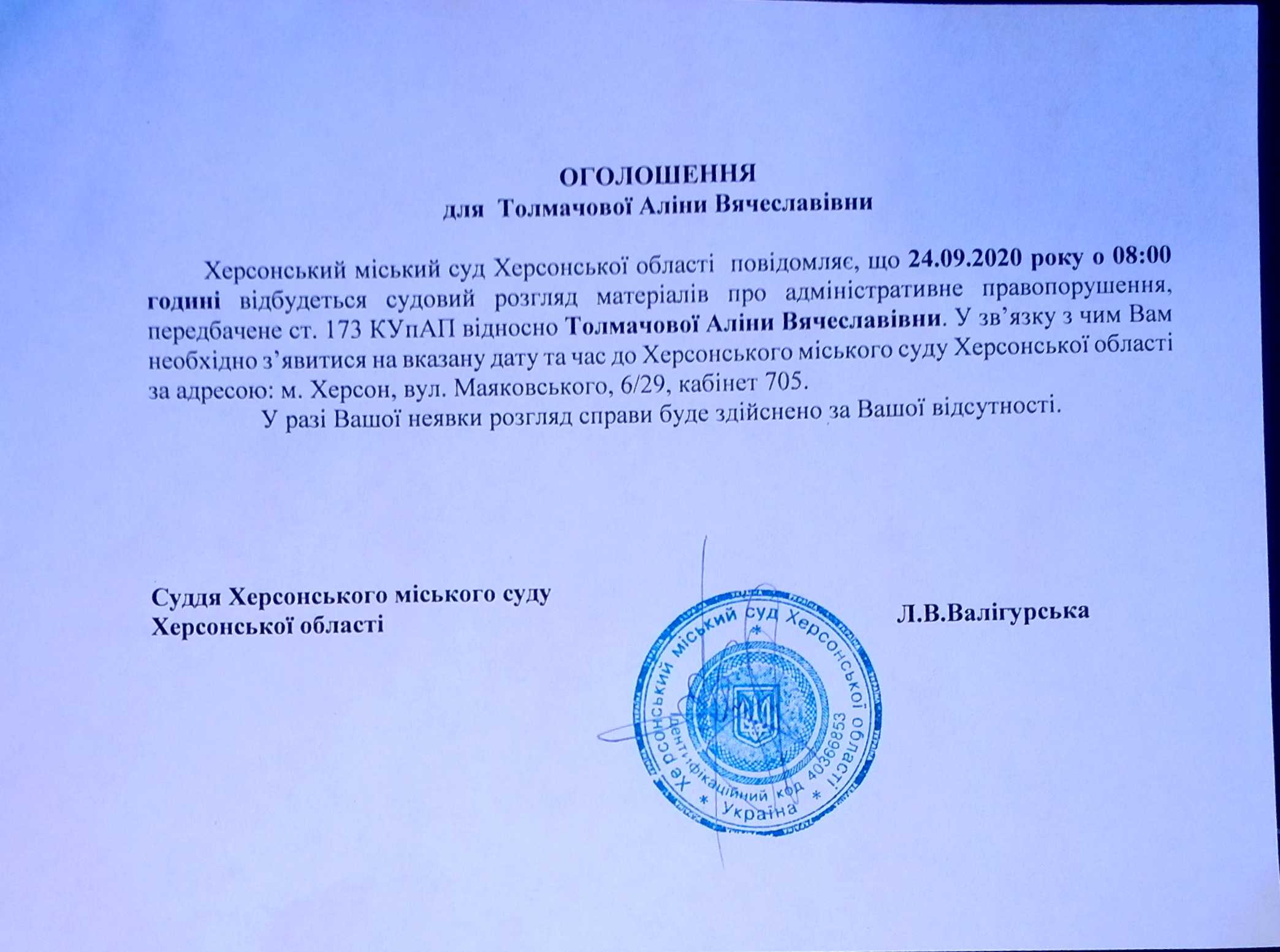 ОГОЛОШЕННЯ для Толмачової Аліни Вячеславівни