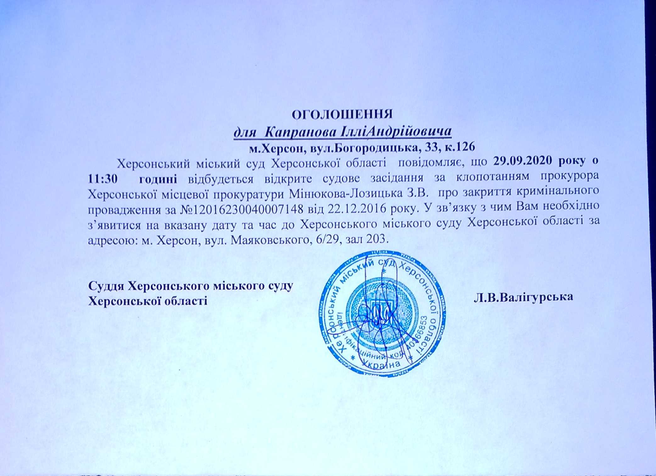 ОГОЛОШЕННЯ ПРО ВИКЛИК ДО СУДУ