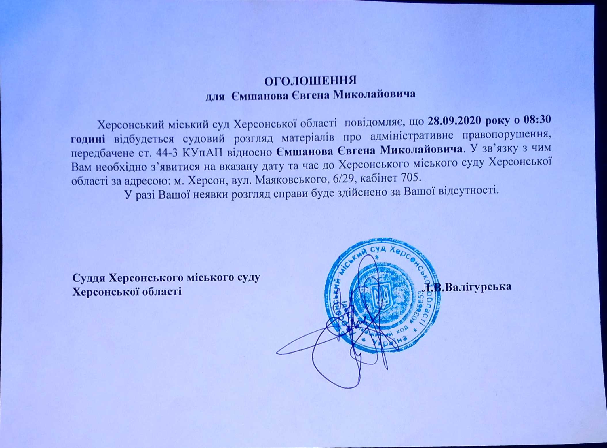 ОГОЛОШЕННЯ ПРО ВИКЛИК ДО СУДУ
