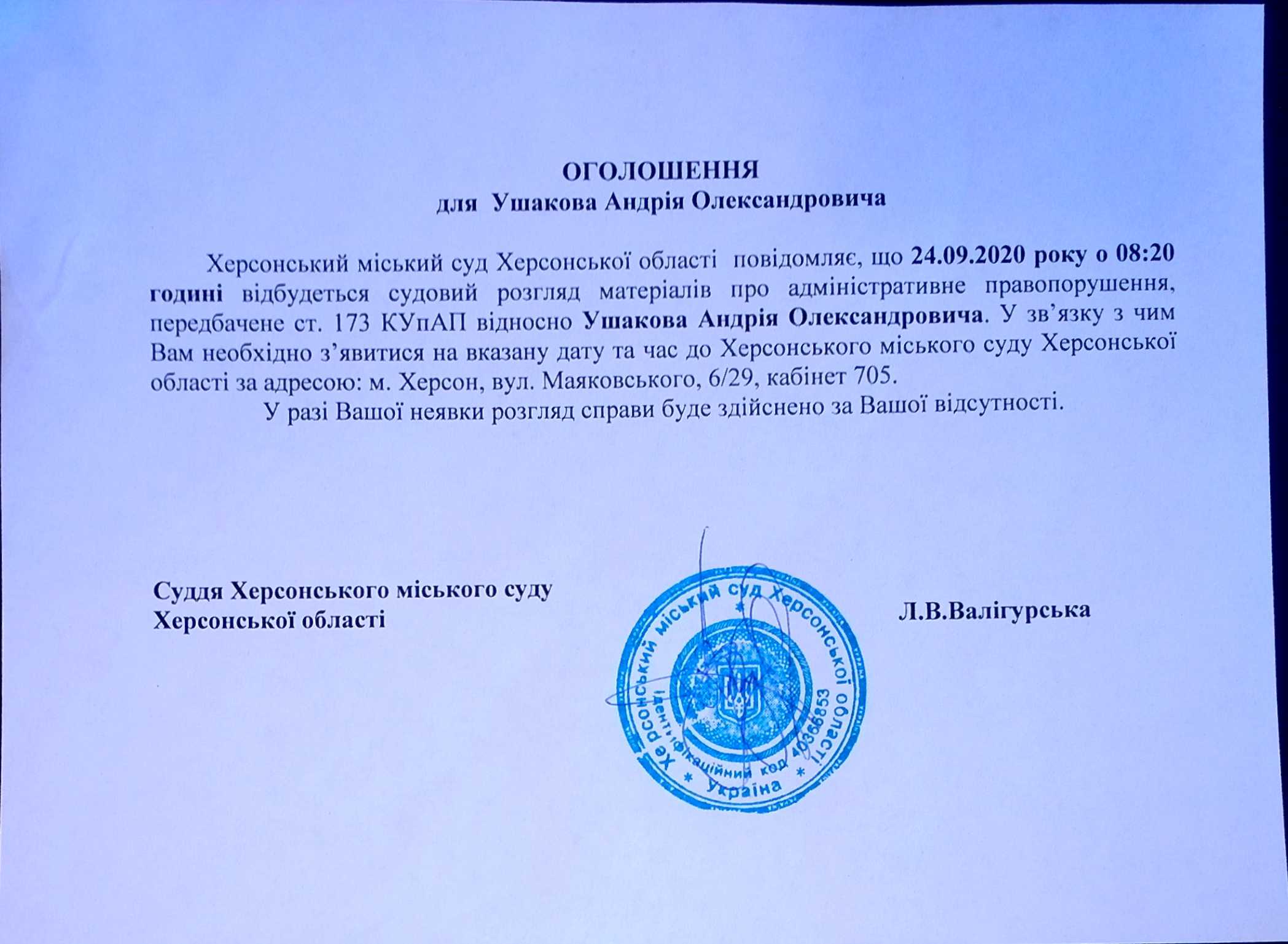 ОГОЛОШЕННЯ для Ушакова Андрія Олександровича