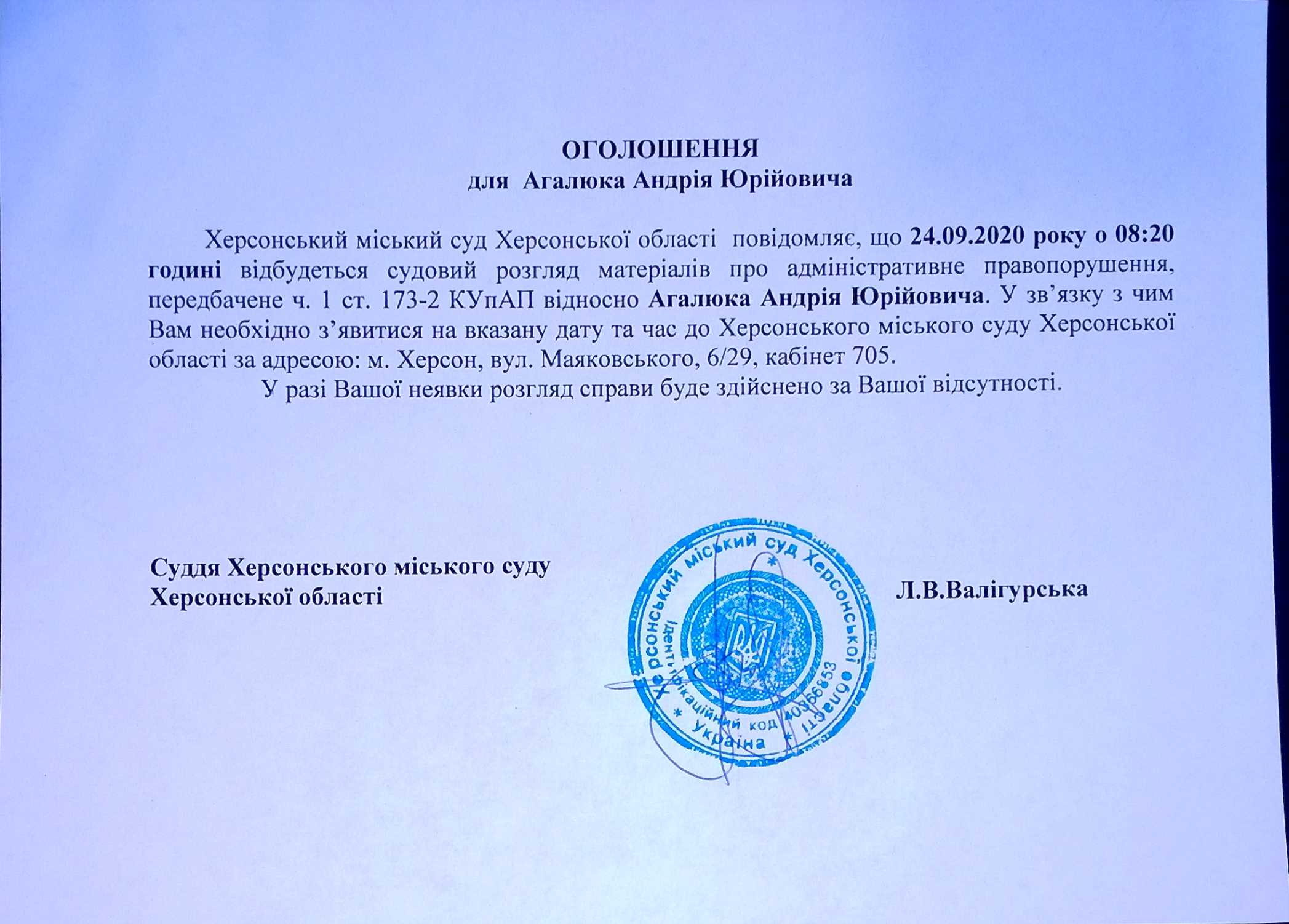 ОГОЛОШЕННЯ для Агалюка Андрія Юрійовича