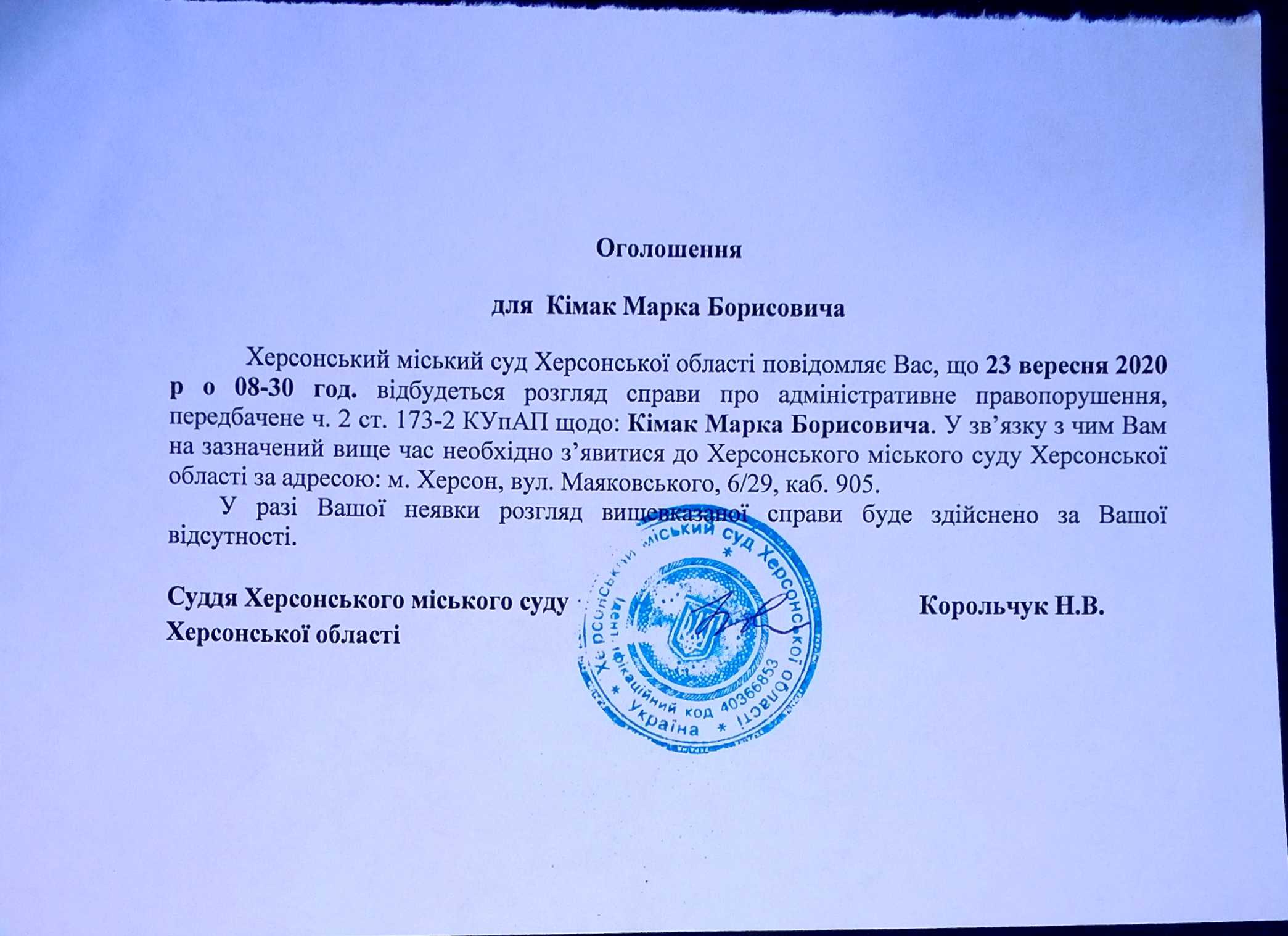 ОГОЛОШЕННЯ для Кімак Марка Борисовича