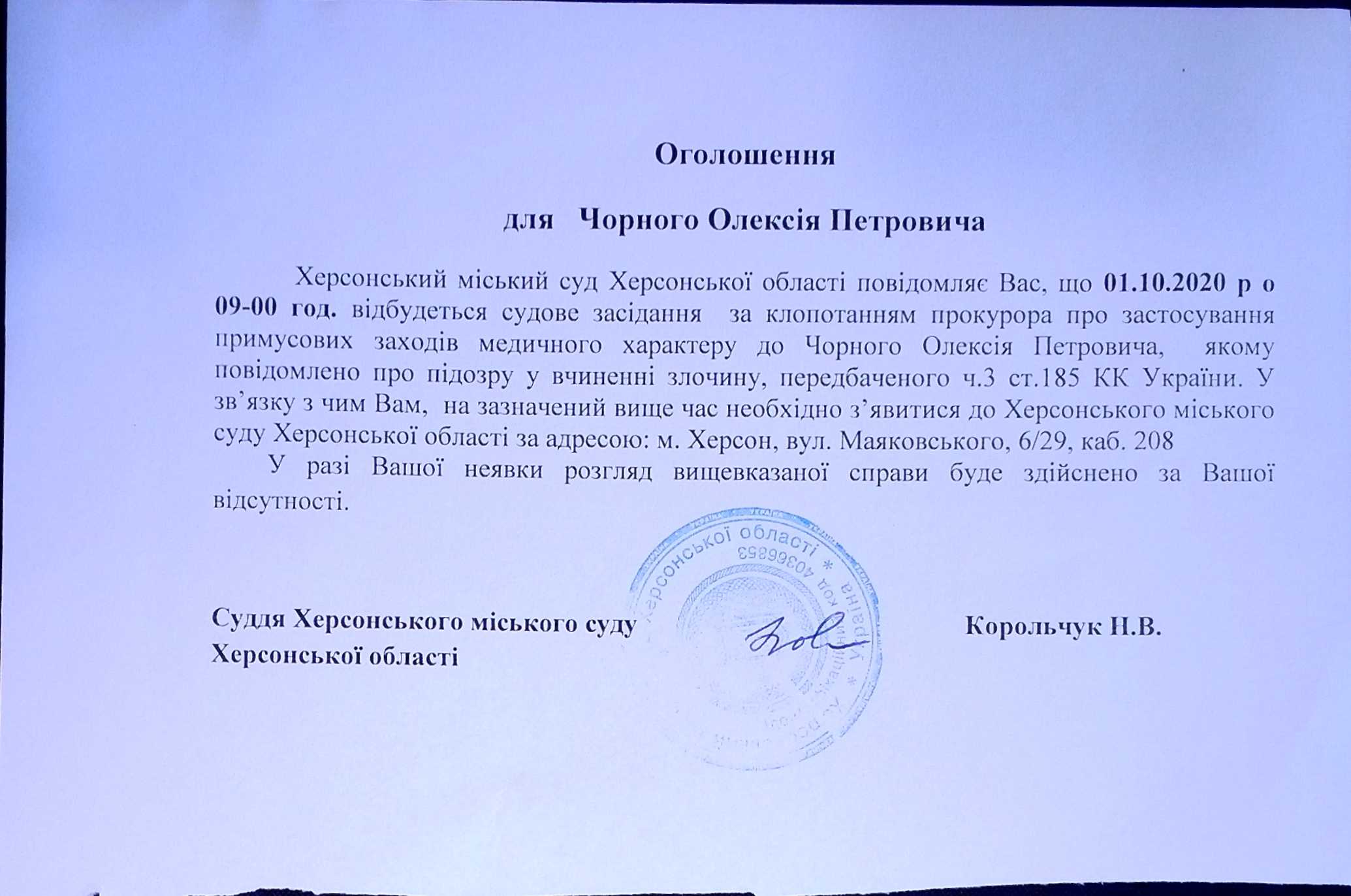 ОГОЛОШЕННЯ ПРО ВИКЛИК ДО СУДУ