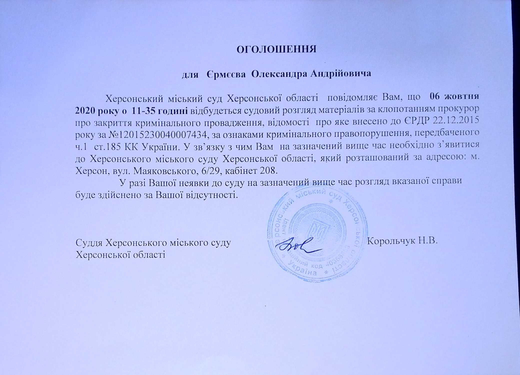 ОГОЛОШЕННЯ для Єрмєєва Олександра Андрійовича