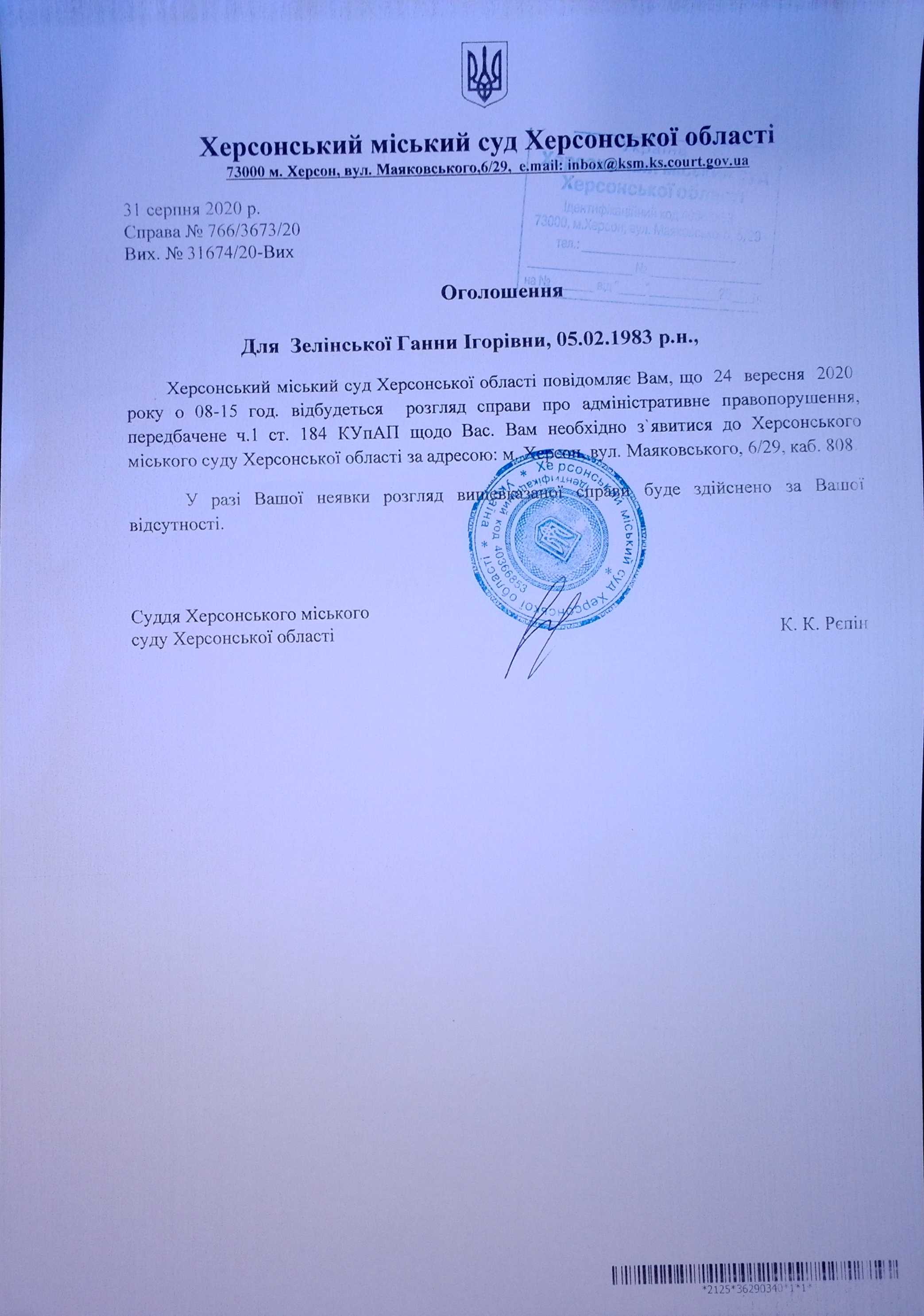 ОГОЛОШЕННЯ для Зелінської Ганни Ігорівни