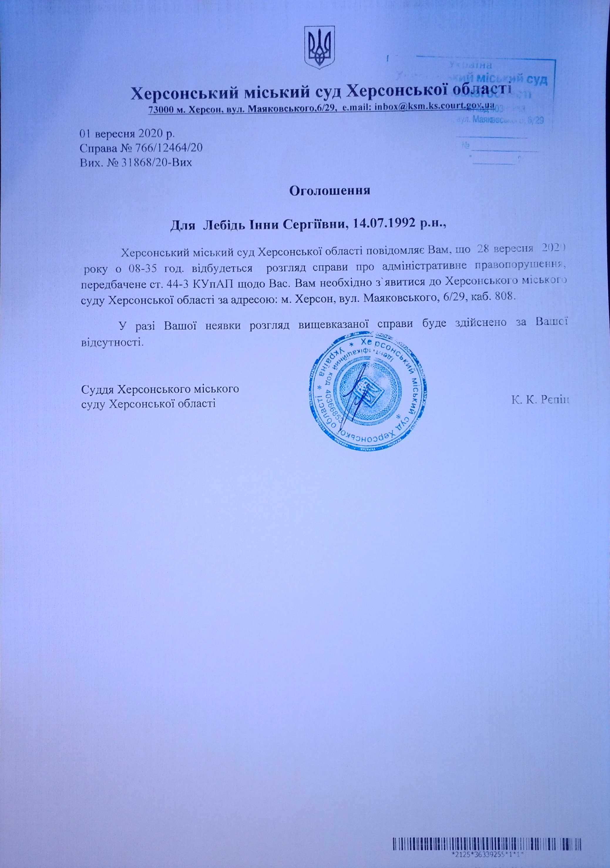ОГОЛОШЕННЯ для Лебідь Інни Сергіївни