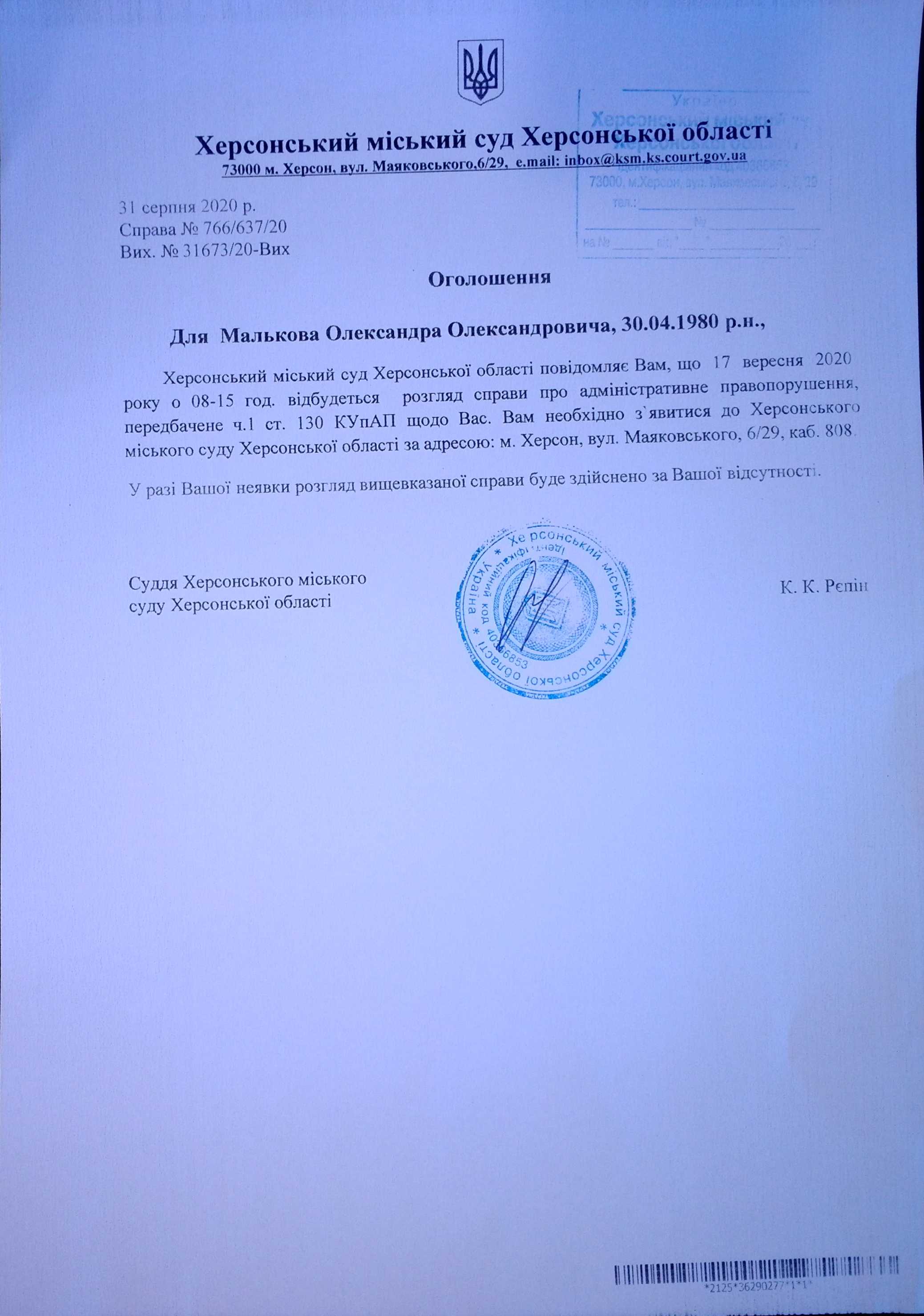 ОГОЛОШЕННЯ для Малькова Олександра Олесандровича