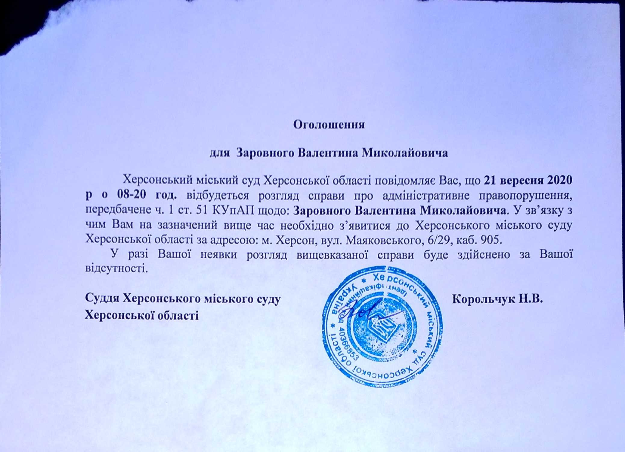 ОГОЛОШЕННЯ ПРО ВИКЛИК ДО СУДУ