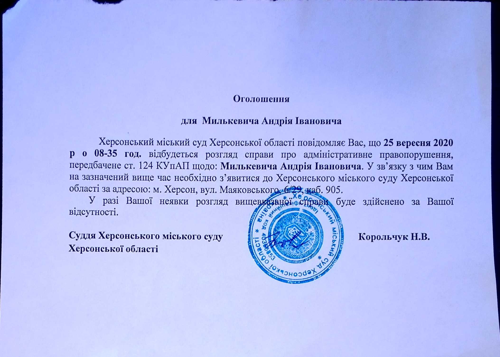 ОГОЛОШЕННЯ для Милькевича Андрія Івановича