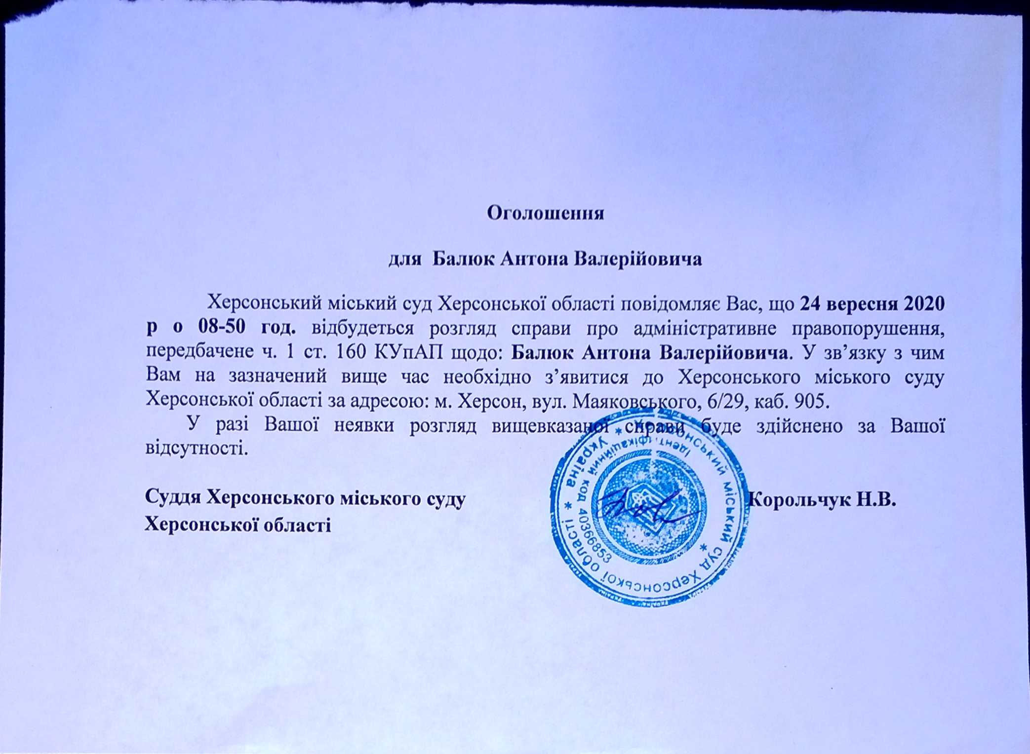 ОГОЛОШЕННЯ для Балюка Антона Валерійовича
