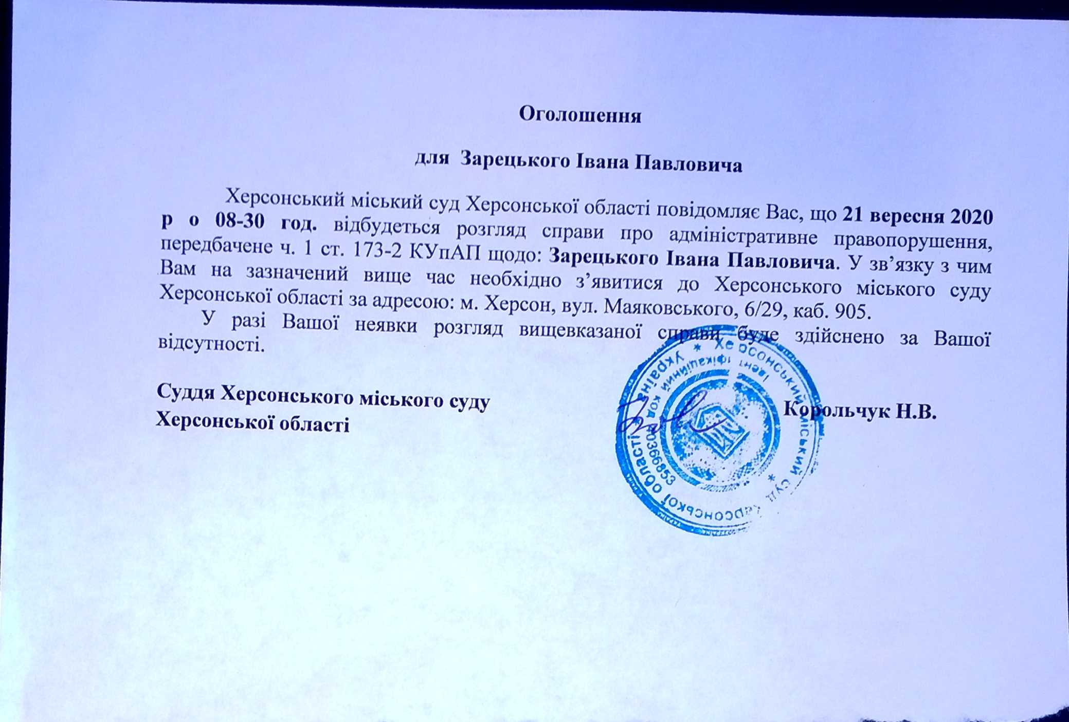 ОГОЛОШЕННЯ для Зарецького Івана Павловича
