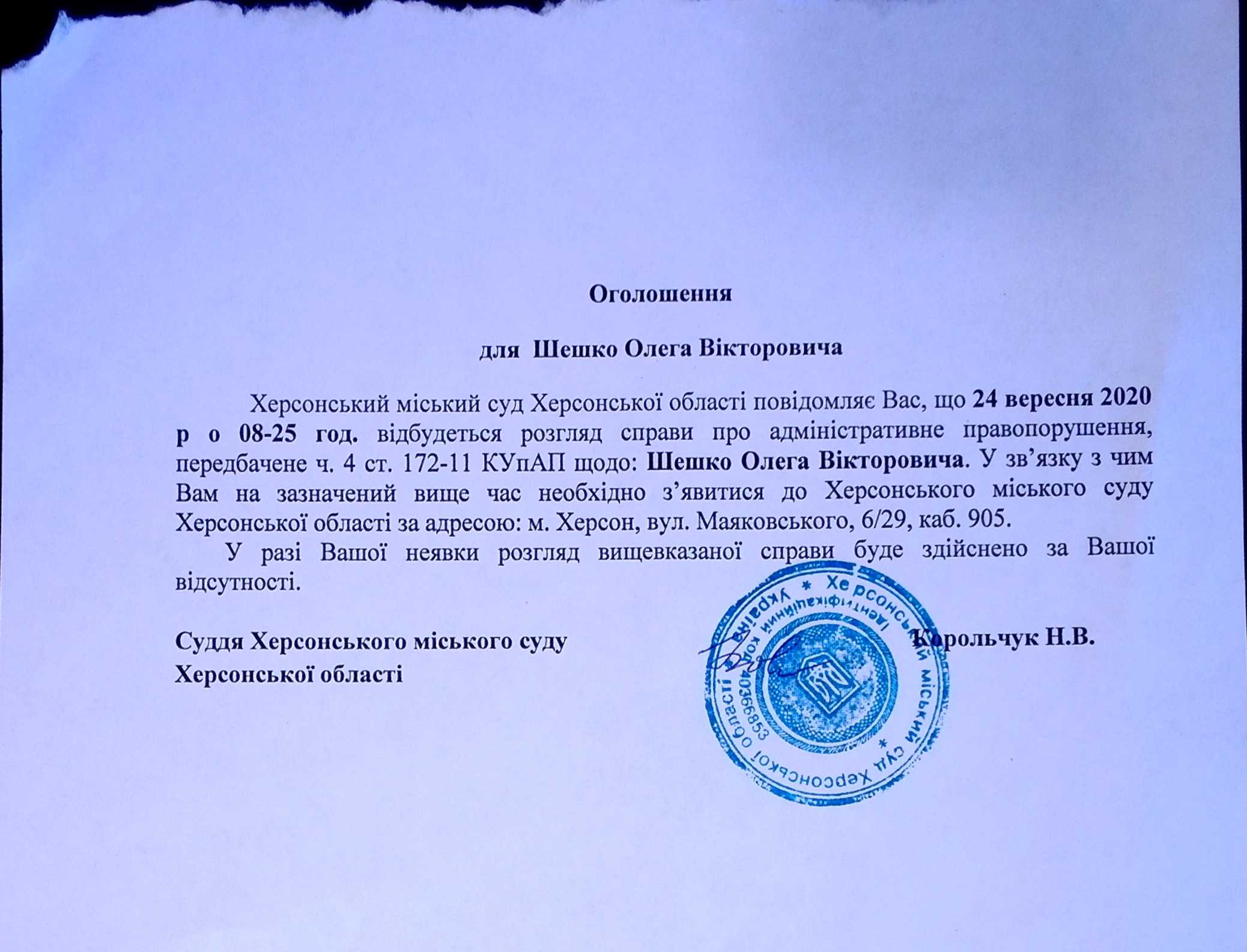 ОГОЛОШЕННЯ для Шешко Олега Вікторовича