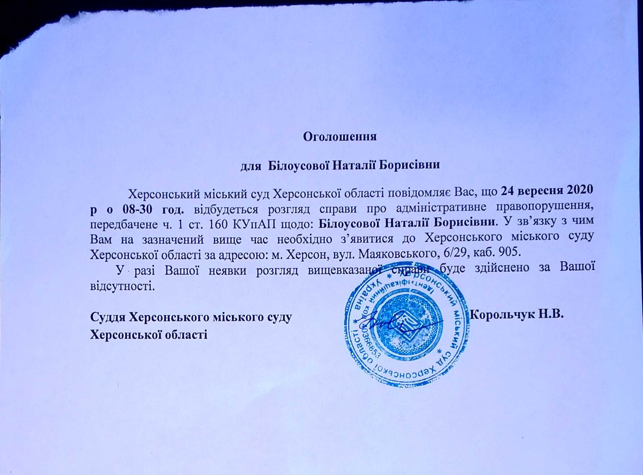 ОГОЛОШЕННЯ для Білоусової Наталії Борисівни